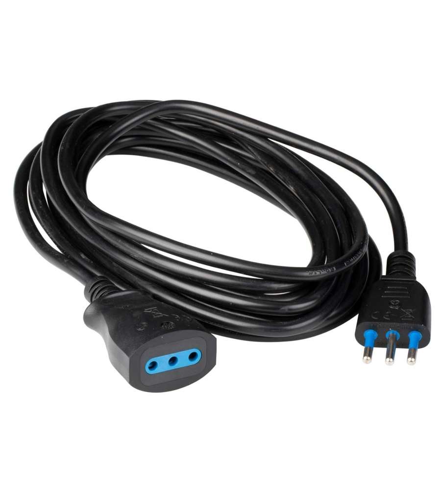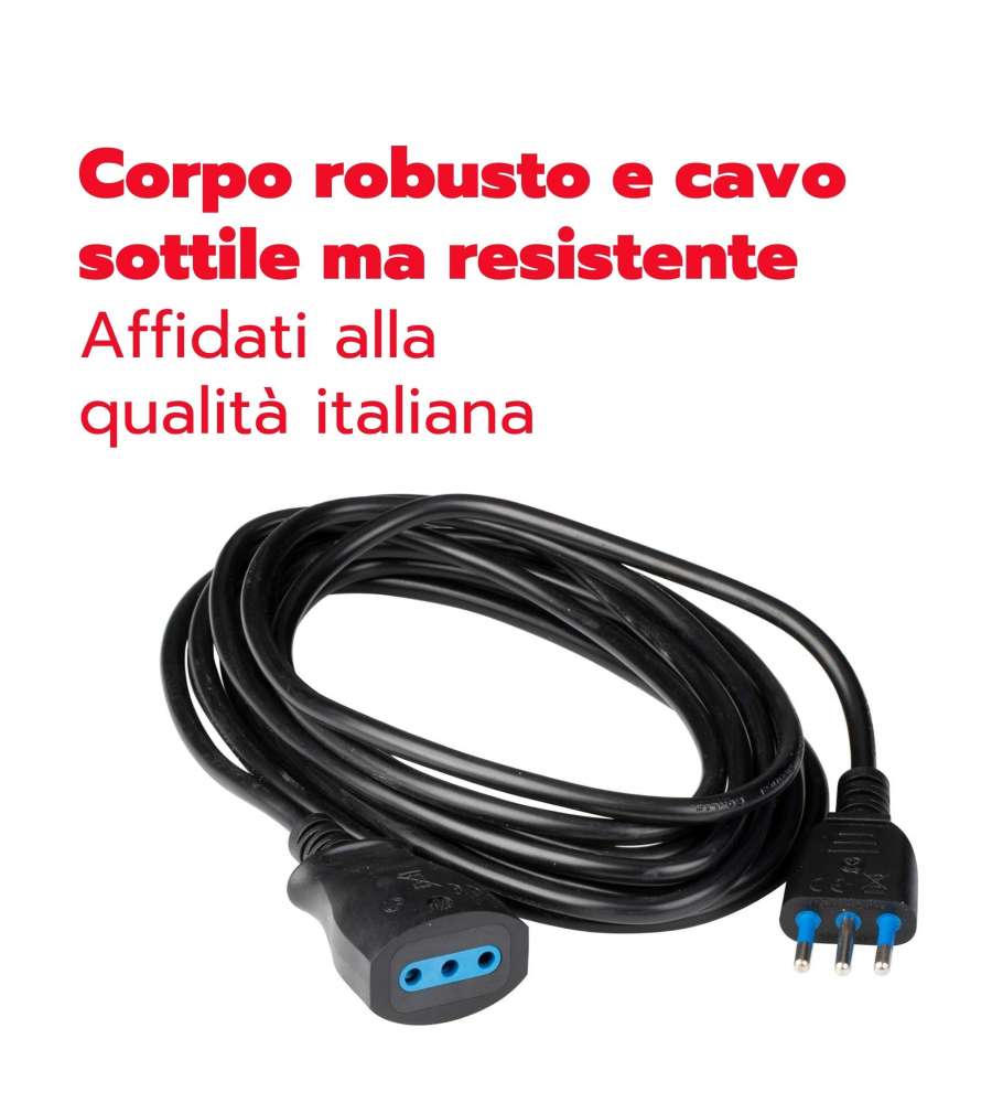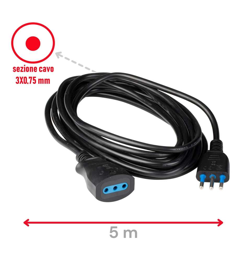 Prolunga elettrica lineare da 5 metri, con cavo H05VV-F 3x0,75 mm², spina e presa italiane 10A 2P+T. Colore nero, certificazioni IMQ e CE. Ideale per uso domestico, resistente e sicura, con protezioni per bambini.Garanzia: