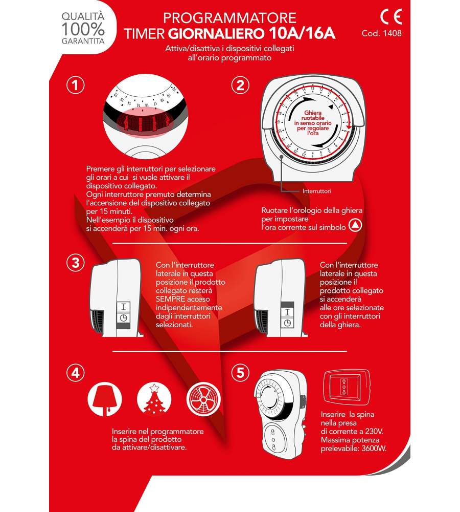 Descrizione: Programmatore giornaliero Poly Pool con spina 16A, ideale per uso domestico. Realizzato in tecnopolimero antiurto, permette una programmazione di 15 minuti. Perfetto per gestire automaticamente i dispositivi elettrici.