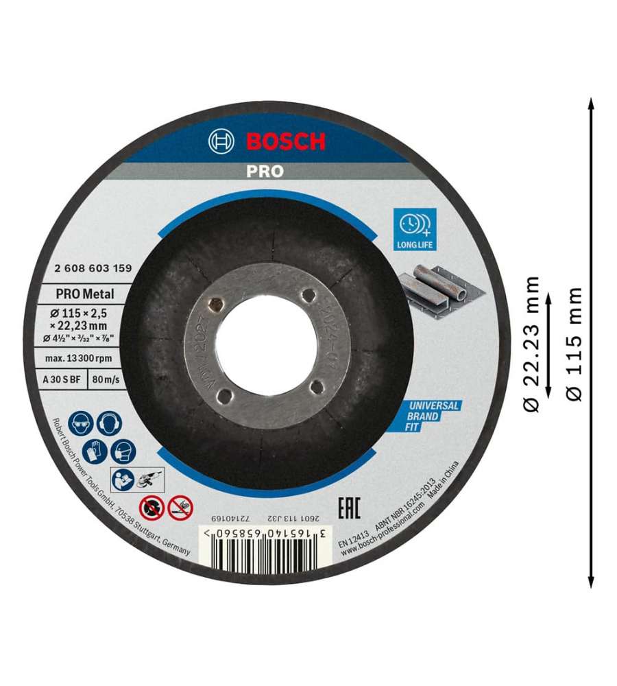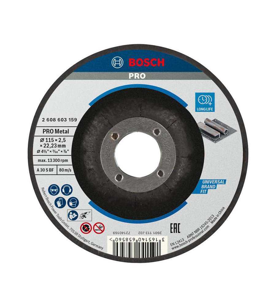 Disco da taglio Bosch Ø 115 x 2,5 mm, ideale per smerigliatrici angolari. Progettato per tagliare metallo, con foro da 22,3 mm. Alta efficienza e lunga durata, velocità massima periferica di 80 m/s. Rivestimento in metallo, colore nero.Garanzia: