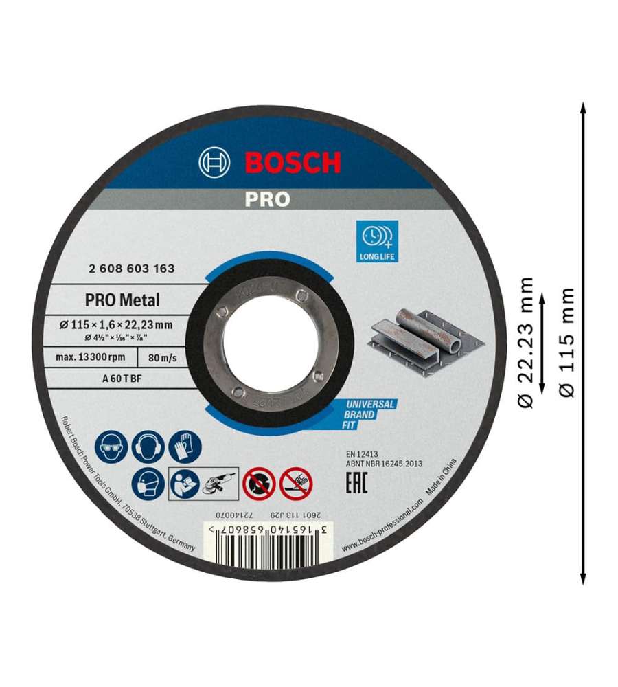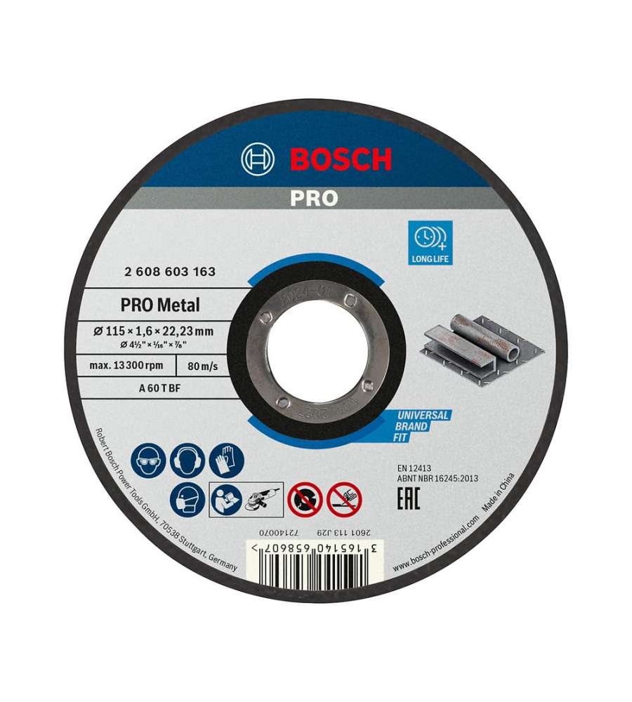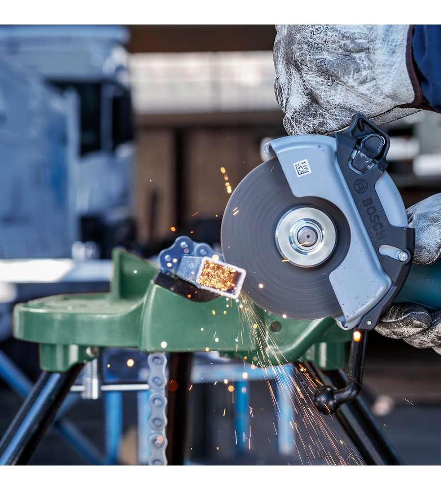 Disco di taglio dritto Bosch Ø 115 mm per metallo, spessore 1,6 mm. Realizzato in ossido di alluminio, compatibile con smerigliatrici angolari. Rispetta la norma di sicurezza EN 12413. Ideale per lavori di taglio su acciaio.Altro 1: