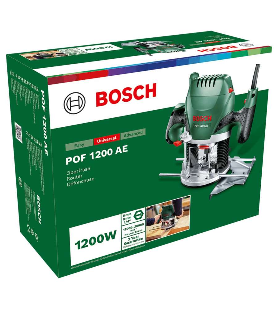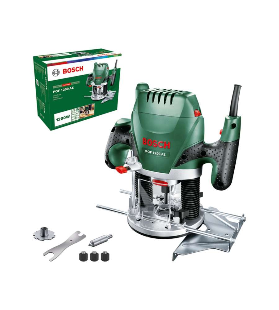 Descrizione: Fresatrice POF1200AE Bosch, potente e versatile, con motore da 1200W e velocità variabile fino a 28.000 giri/min. Include accessori per fresature precise e attacco per aspirazione polveri.
