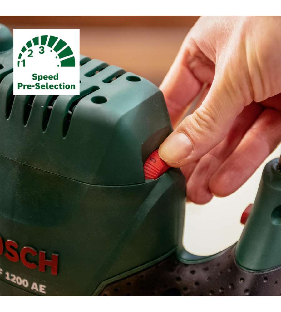 Fresatrice Bosch POF1200AE con motore potente da 1200 Watt, velocità regolabile 11000-28000 giri/min, profondità fresatura fino a 55 mm. Include attacco per aspirazione polvere, sistema SDS e impugnatura Softgrip per un uso confortevole.Altro 1: