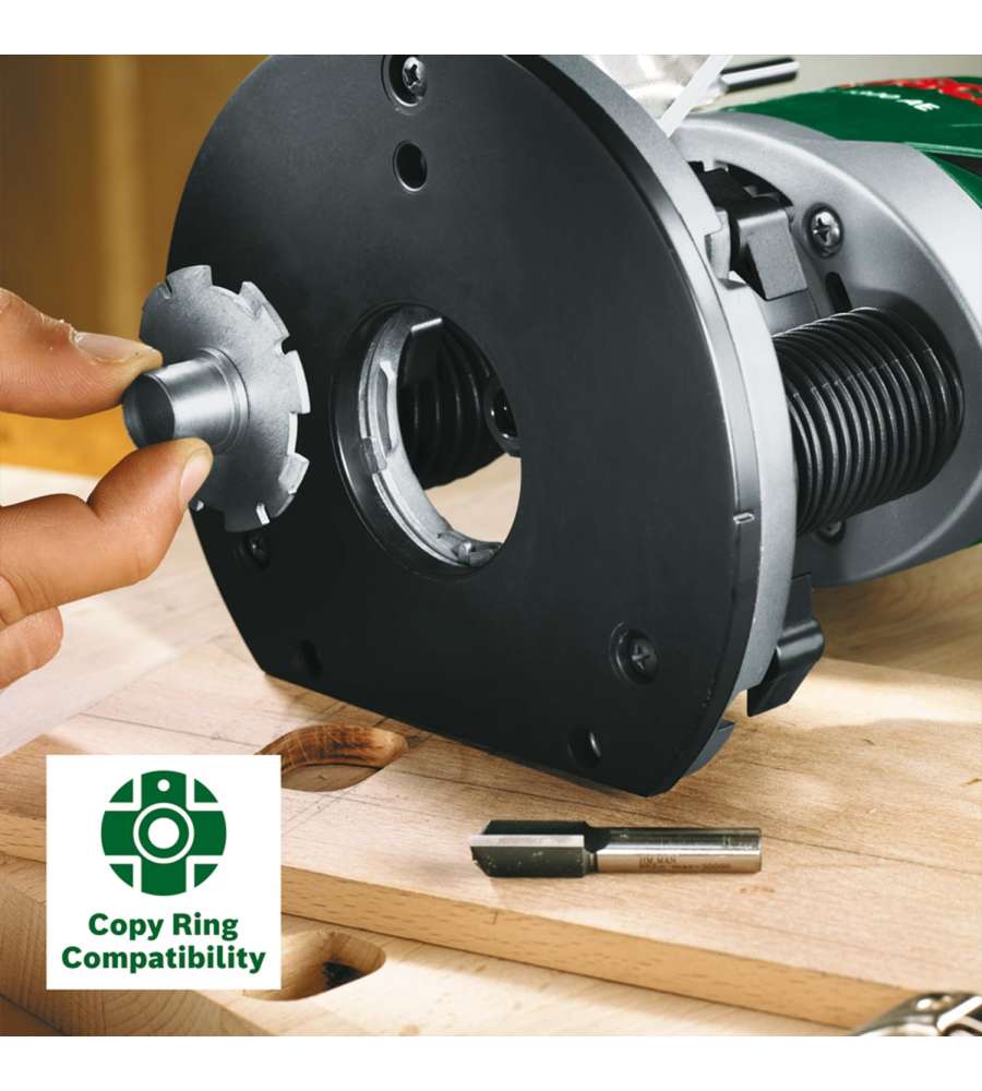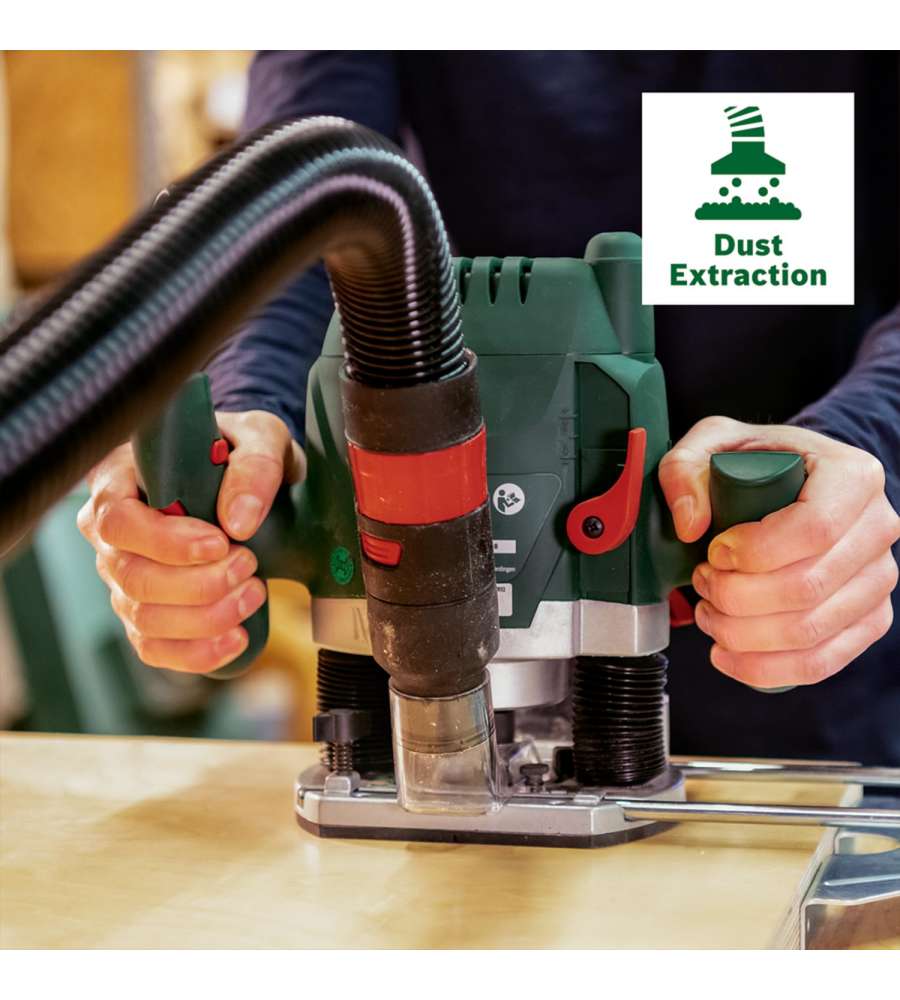 Perno di centraggio, fresa per scanalature, pinze di serraggio (3 pezzi), chiave fissa, guida parallela, adattatore di aspirazioneCaratteristiche: