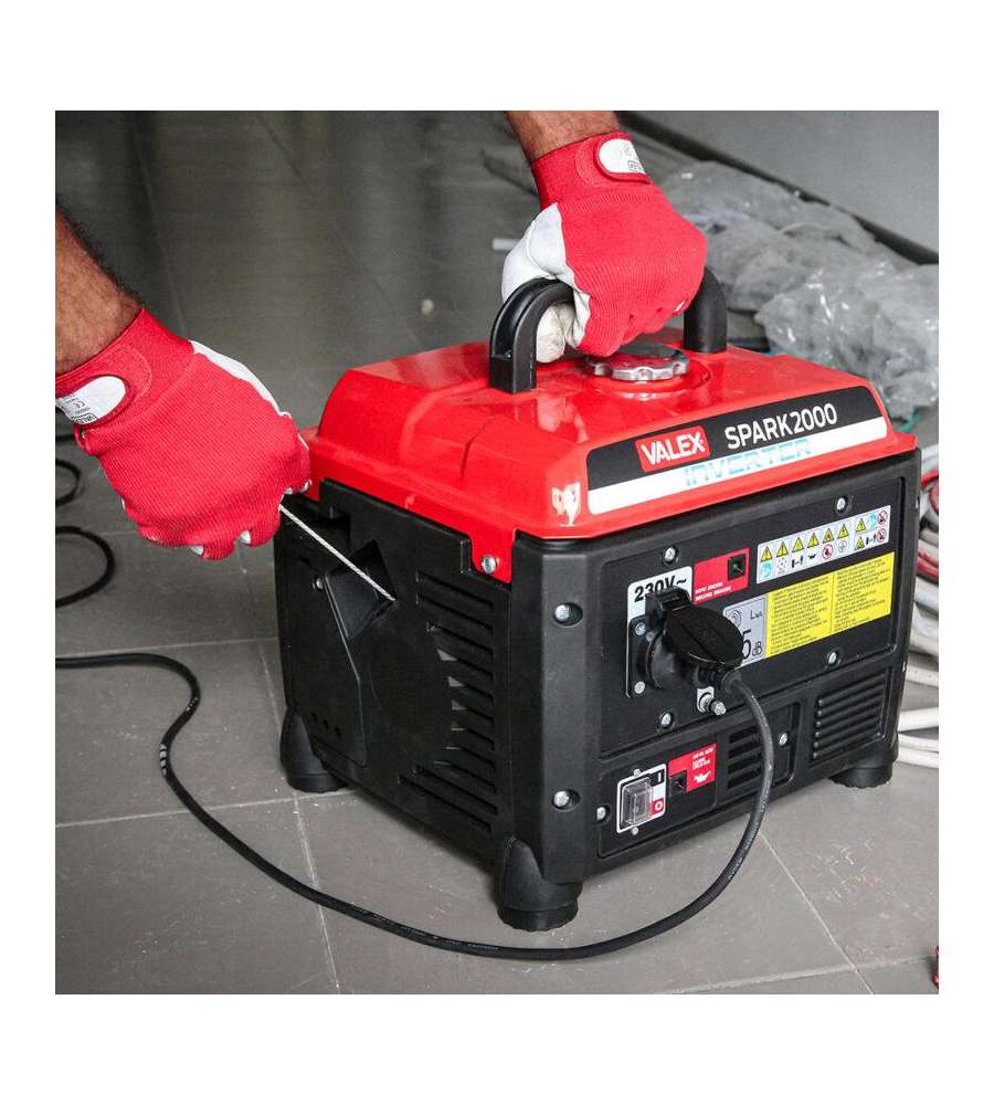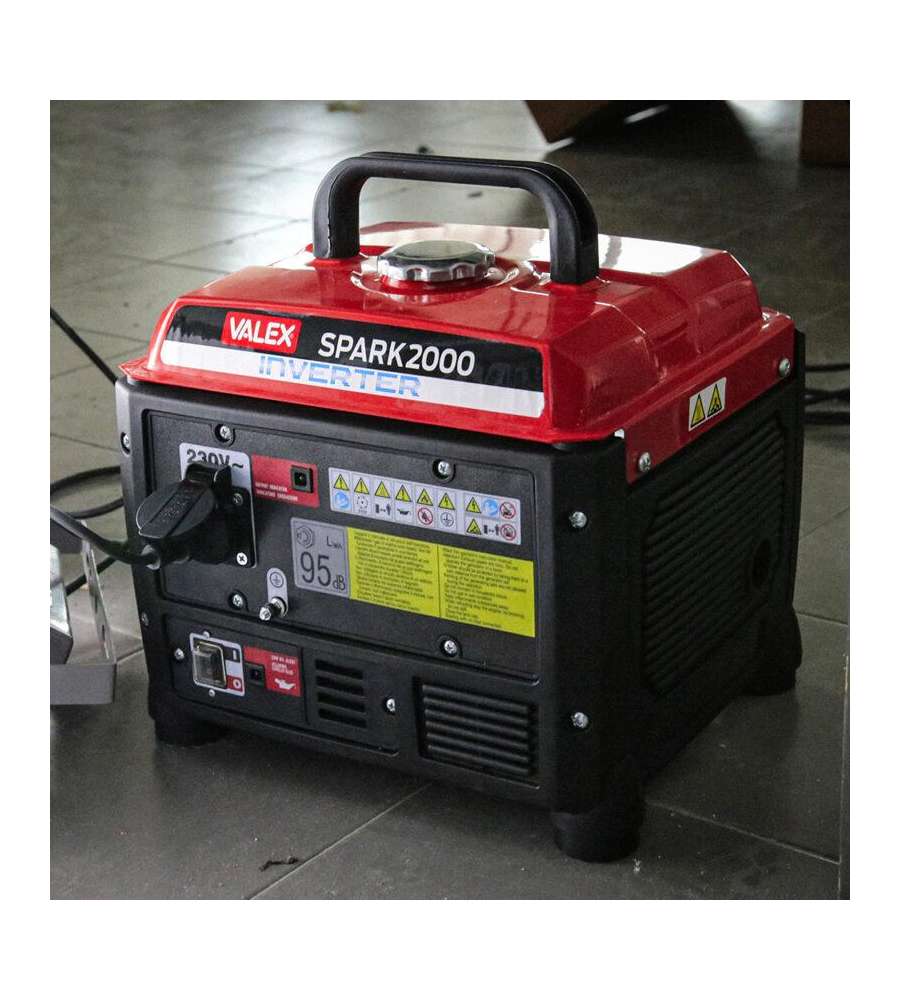 Generatore Inverter Spark 2000: silenziato, 4 tempi OHV, tensione costante, arresto automatico per sovraccarichi/basso olio, 1.2 KVA, 2.20 HP, serbatoio 4L, autonomia 6h, avviamento a strappo, carburante benzina verde.Caratteristiche: