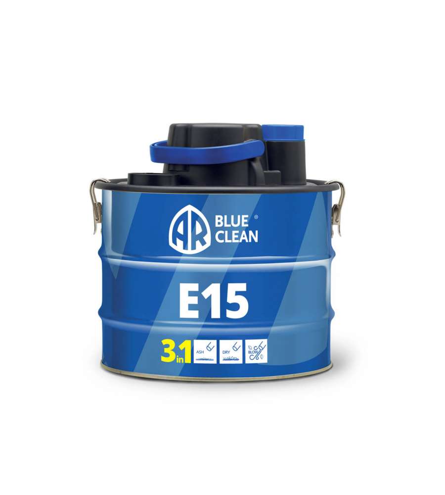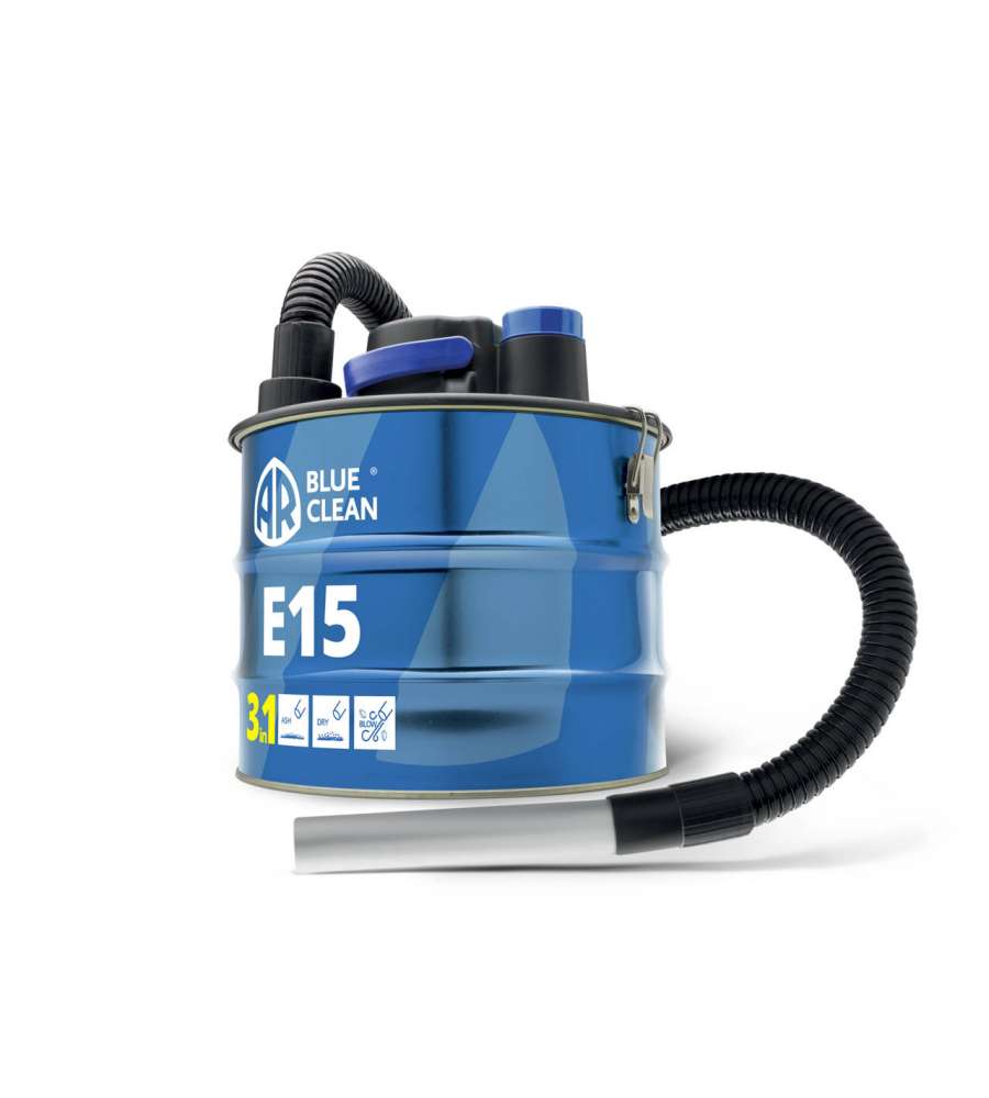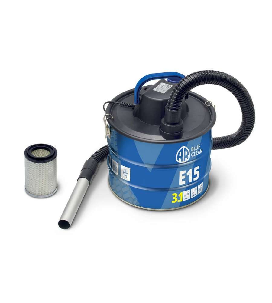 Aspiracenere AR BLUE CLEAN 15lt mod. E15: ideale per ceneri fredde da stufe, camini e barbecue. Dotato di filtro Hepa con protezione in rete metallica e funzione soffiaggio. Fusto in acciaio, maniglia integrata, tubo flessibile in metallo.