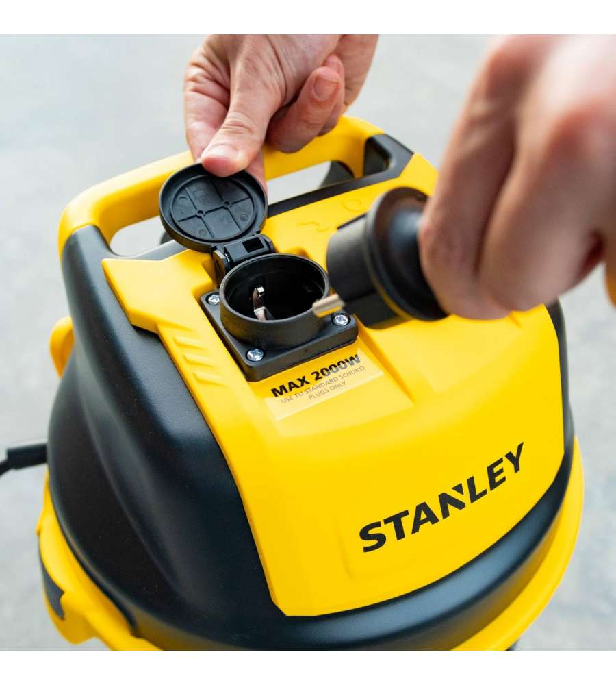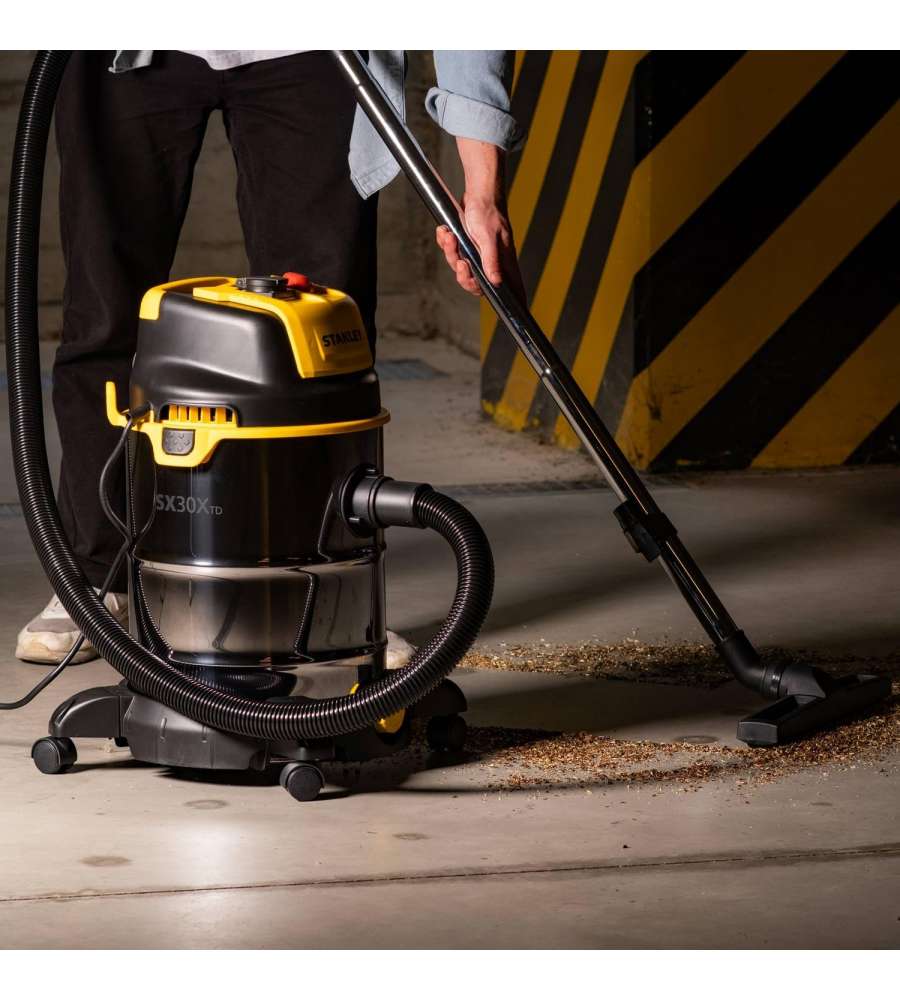 Aspiratore Stanley 1600W per solidi e liquidi, capacitŕ 30L, portata aria 36,5 l/s, funzione soffiante, multiaccessoriato, fusto in acciaio inox con tappo di scarico liquidi, design moderno con presa per elettroutensili.Altro 1: