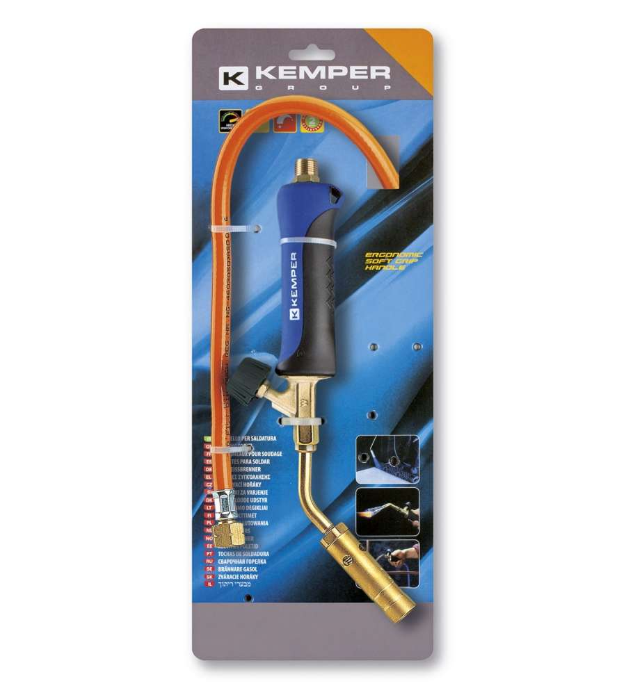 Descrizione: Cannello Curvo Kemper con tubo da 1,5 m e beccuccio Ø 20 mm, ideale per saldature di precisione. Leggero e maneggevole, peso solo 0,7 kg.