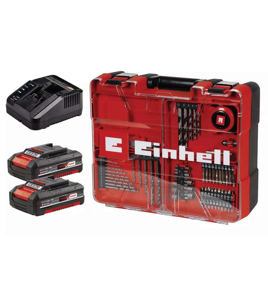 Trapano avvitatore a batteria Einhell con 650W, coppia max di 40Nm e mandrino autoserrante da 13mm. Include 2 batterie Power X-Change, caricabatteria rapido, 64 accessori e luce LED per un'illuminazione ottimale. Ergonomico e versatile.Altro 1: