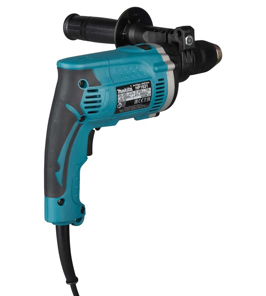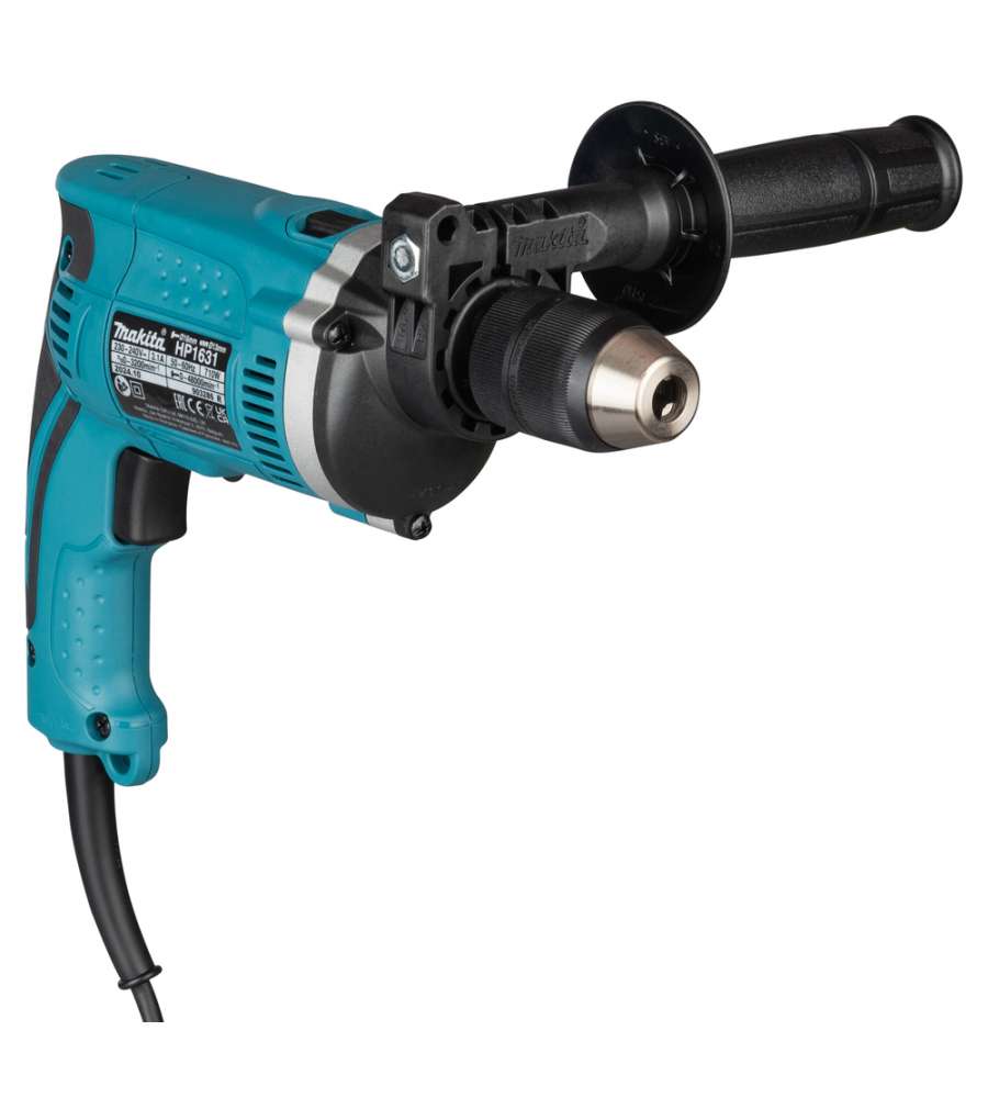 Trapano a percussione Makita HP1631 da 710 W, con velocità a vuoto fino a 3200 min?¹ e impulsi fino a 48000 min?¹. Capacità mandrino 1,5-13 mm, foratura legno fino a 60 mm, muratura e calcestruzzo 16 mm. Peso 2,0 kg, cavo 2,0 m.Altro 1: