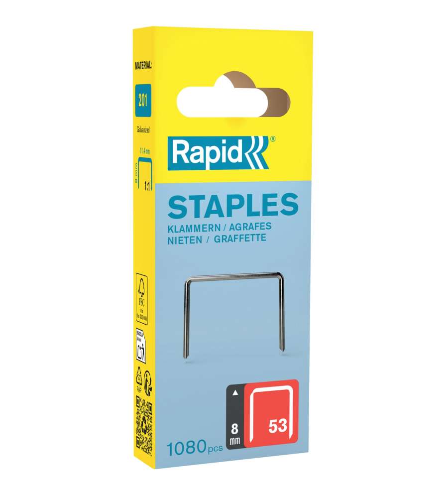 Descrizione: Graffe Rapid N.53 da 6 mm in acciaio zincato, confezione da 1080 pezzi. Filo fine per un fissaggio ottimale di tessuti ed etichette. Punta affilata per penetrazione delicata, ideale per lavori di precisione.