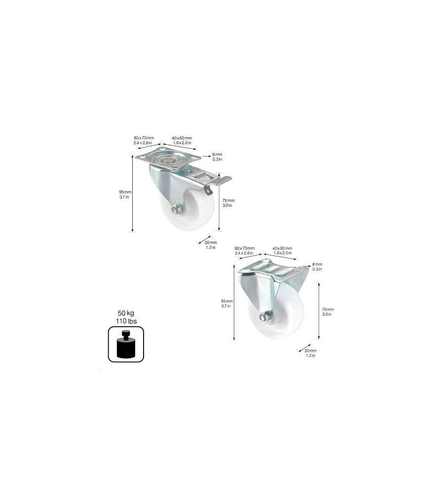 Set di ruote professionale composto da 2 ruote fisse e 1 elevatore, con capacità di carico fino a 200 kg. Realizzate in acciaio zincato e poliammide, diametro ruota di 75 mm. Montaggio semplice, adatte a pavimenti robusti.Altro 1: