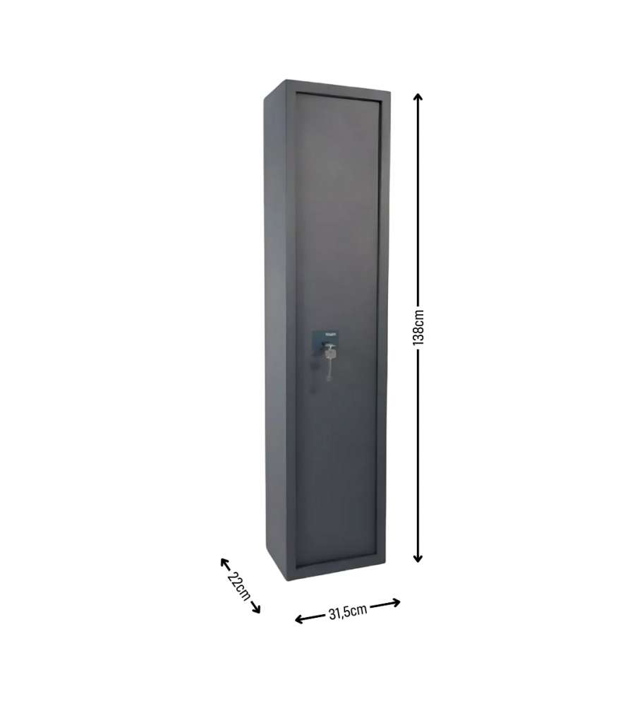 Armadio porta fucile 5 posti con tesoretto, corpo in acciaio verniciato grigio antracite, spessore 2 mm, chiusura con chiave a doppia mappa, dimensioni 1380x315x220 mm."Ottimo prodotto ha soddisfatto le nostre aspettative"