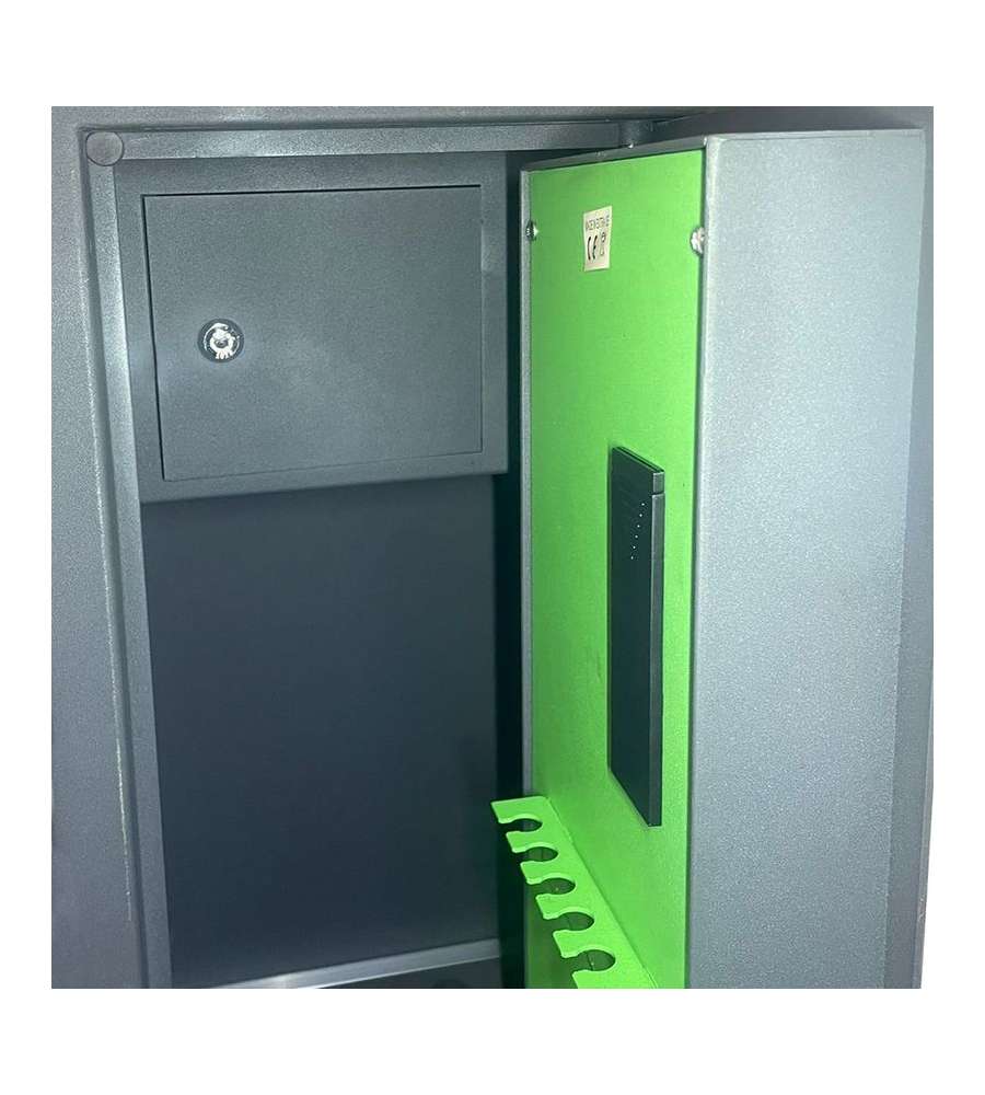 Porta fucile elettronico da 5 posti con tesoretto, corpo in acciaio verniciato grigio antracite, chiusura diretta dei catenacci da 23 mm, apertura elettromagnetica, 3 codici di apertura impostabili.Altro 1:
