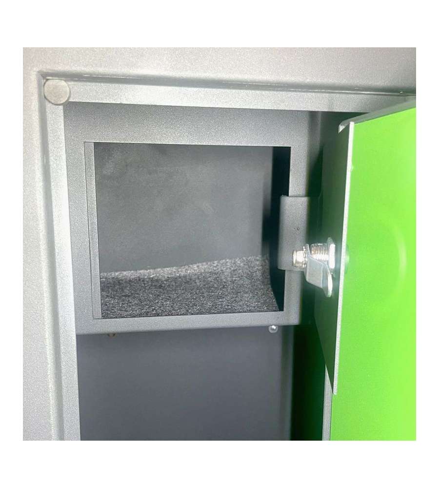5 posti per fucili e tesoretto porta munizioni, sportello interno rispetto al corpo, apertura d’emergenza tramite batteria da 9V inclusa.