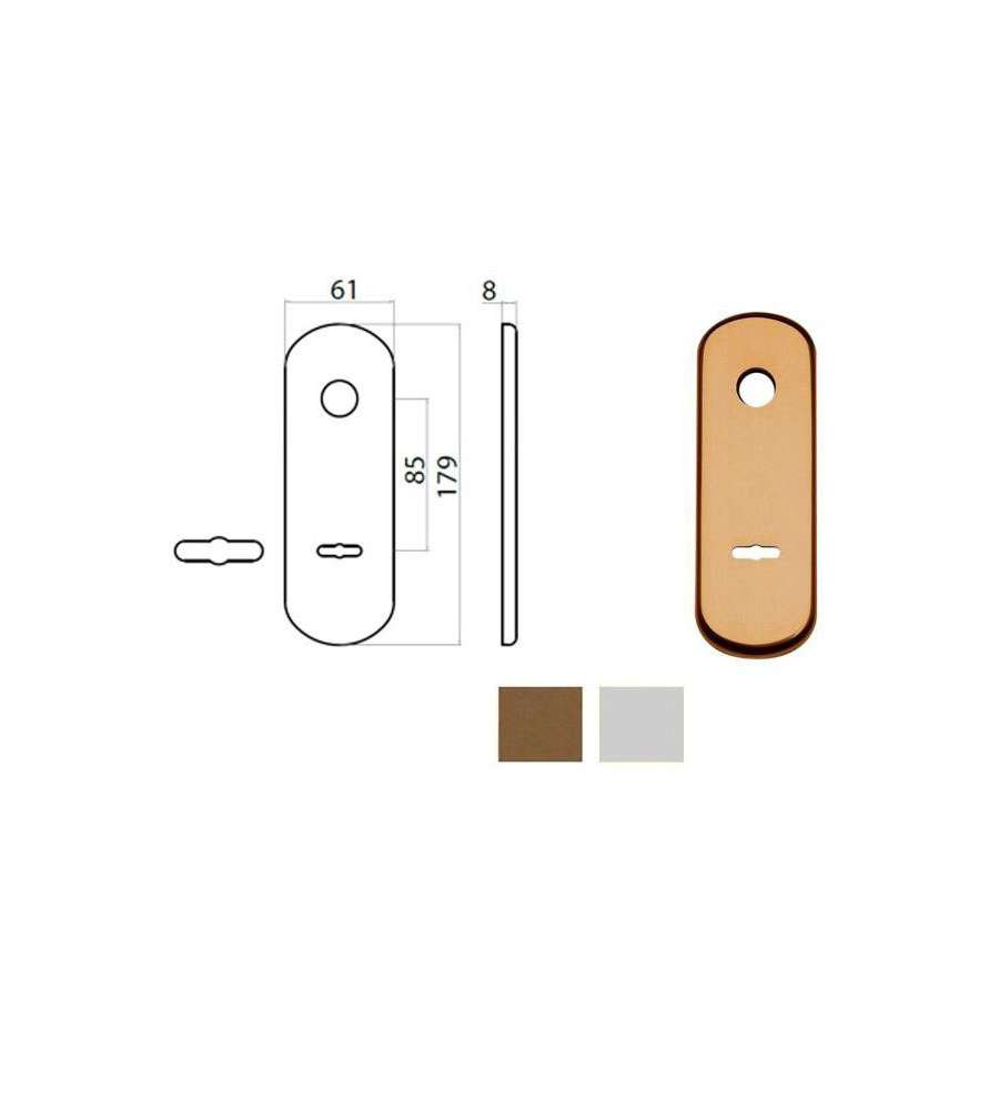 Placca Ghibli in alluminioargentato, dimensioni 61x179 mm, interasse 85 mm. Design universale con foro per chiave doppia mappa, adattabile su piastra Dierre. Ideale per porte blindate e zanzariere.Altro 1: