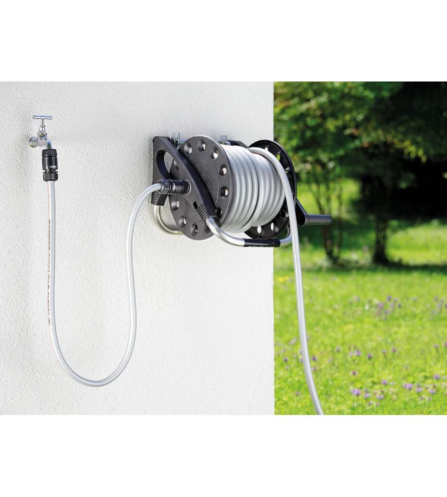 Descrizione: Avvolgitubo a parete Aquapony® con 15 metri di tubo Ø 1/2" (12-17 mm), presa rubinetto 3/4" (20-27 mm) con riduzione 3/4"-1/2", 4 raccordi automatici (uno con acquastop), lanciaspruzzo.