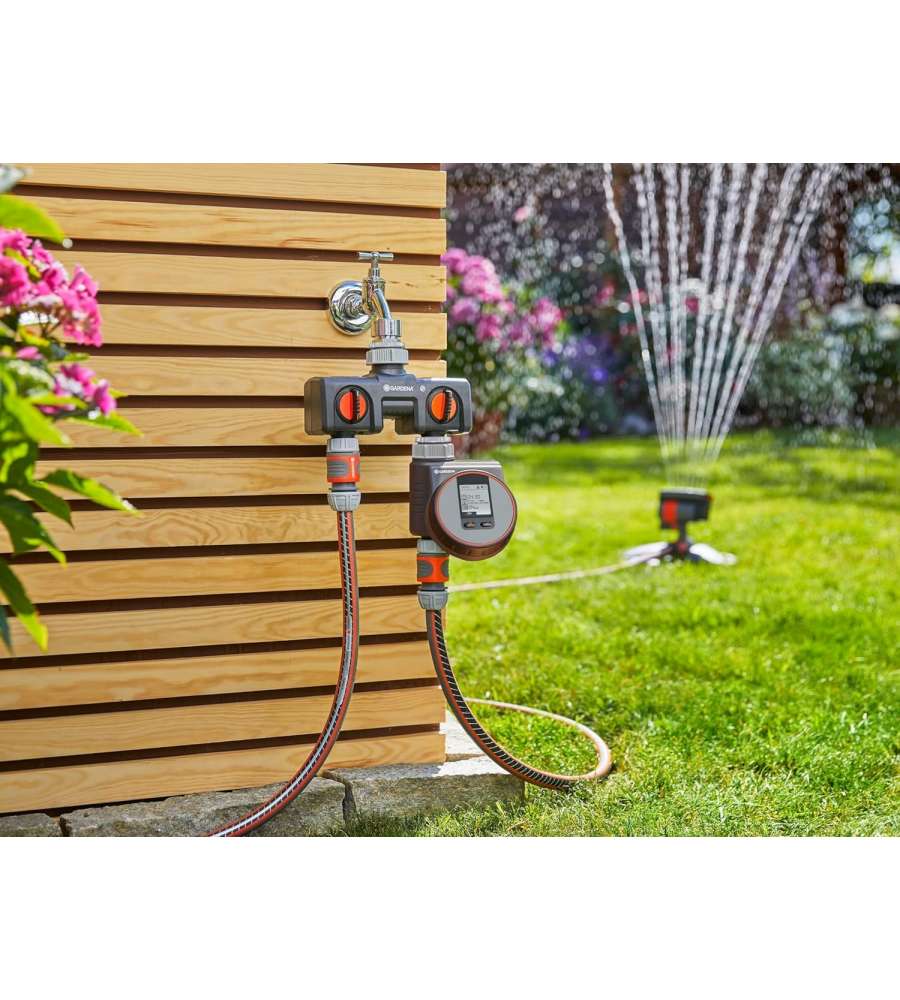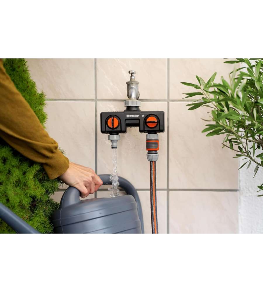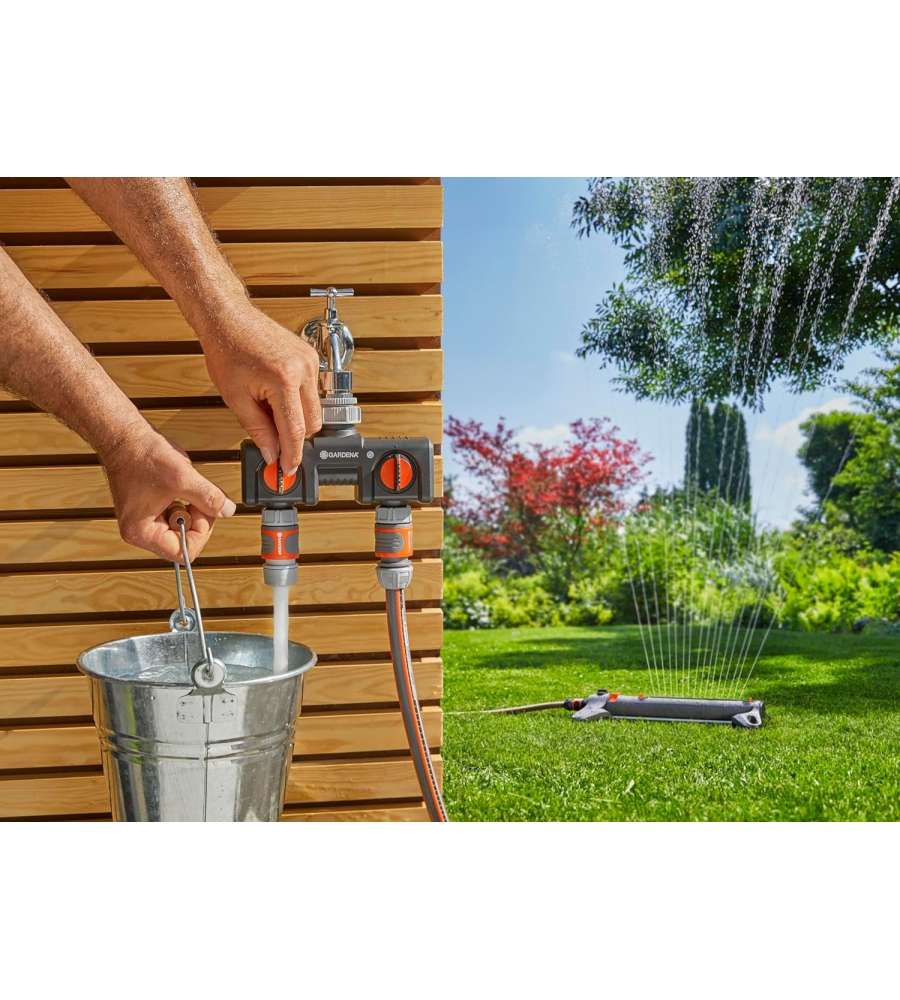 Collegamento simultaneo di 2 dispositivi al rubinetto, flusso d'acqua regolabile e chiudibile, realizzato in ottone, compatibile con rubinetti da 3/4" e 1", prodotto originale Gardena, garanzia di 2 anni, Made in Germany.Destinazione d'uso: