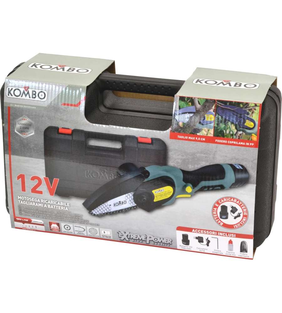 Descrizione: Scopri la minisega a batteria Kombo, leggera e maneggevole, ideale per potature. Include batteria 12V 1500mAh, caricatore 0,7A, flacone porta olio, fodero copirlama. Velocità 2500 giri/min e capacità di taglio 9,5 cm. Pronta all'uso!