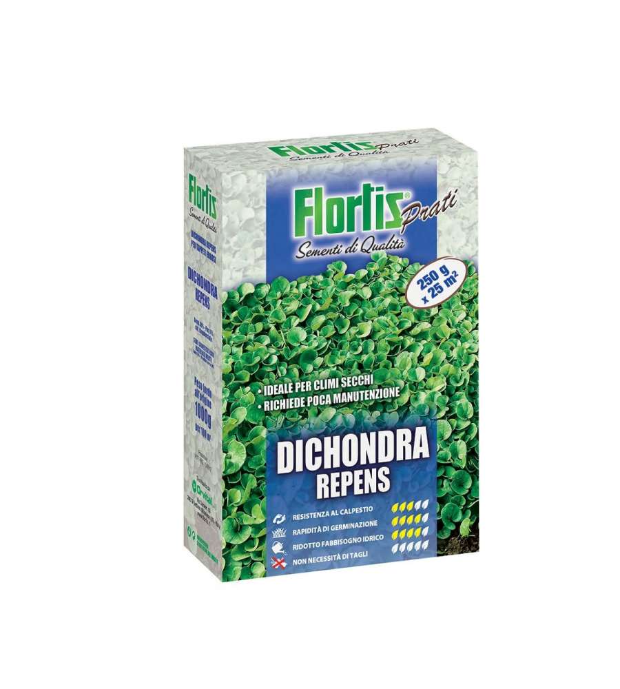 Dicondra semenza per prato 250 g: essenza perenne, resistente alla siccità, minime irrigazioni e tosature necessarie. Copre 25 mq.Esposizione: