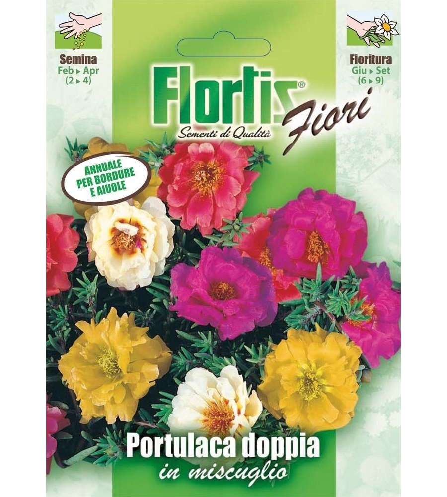 Sementi di Portulaca Doppia Mix Flortis: fiori vivaci e resistenti, perfetti per bordure soleggiate. Semina facile da febbraio ad aprile. Altezza 10-15 cm, fioritura da aprile a maggio. Atossico per animali.Destinazione d'uso: