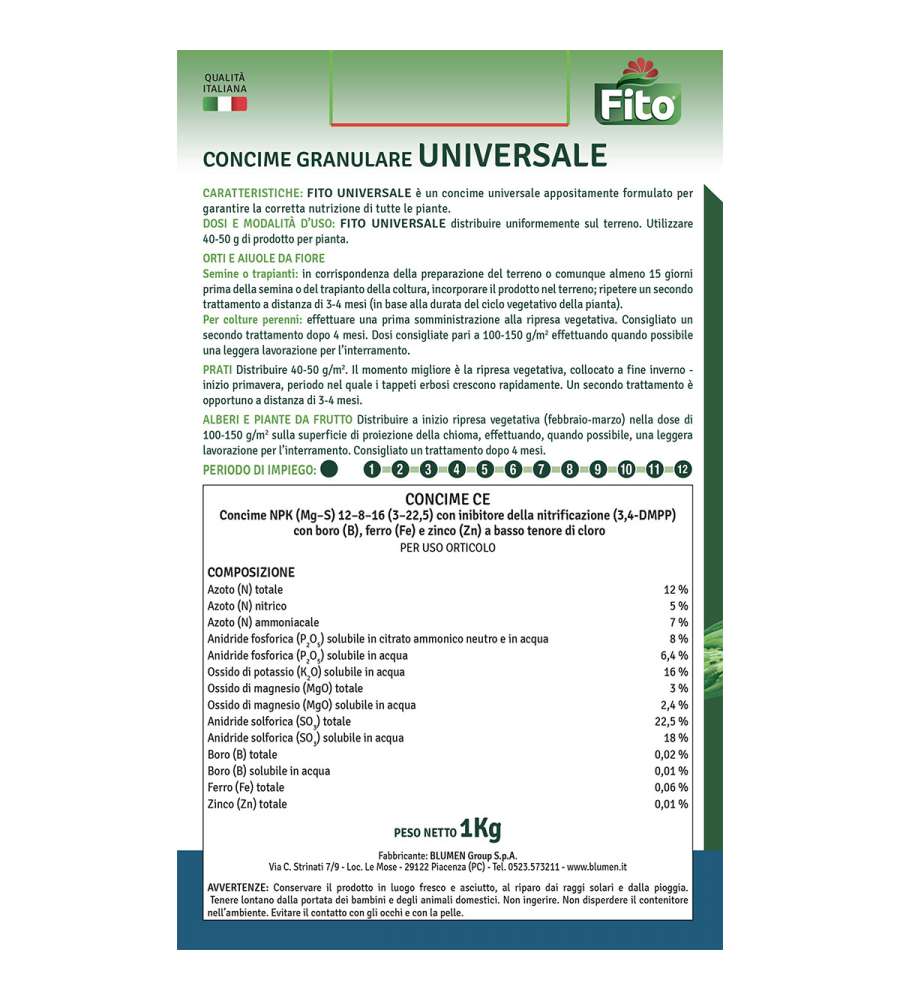 Descrizione: Concime universale granulare ideale per tutte le piante, garantisce un rilascio bilanciato di Azoto, Fosforo e Potassio per una crescita sana e vigorosa.