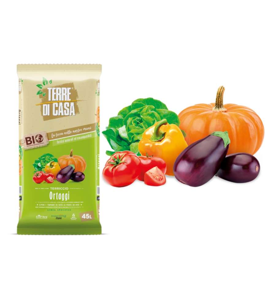 Terriccio biologico per ortaggi, formato 45L. Linea: Specifici. Composto da torba, fibra di cocco e humus di corteccia, garantisce raccolti abbondanti e sani, senza sostanze chimiche. Ideale per semine e trapianti tutto l'anno.Destinazione d'uso:
