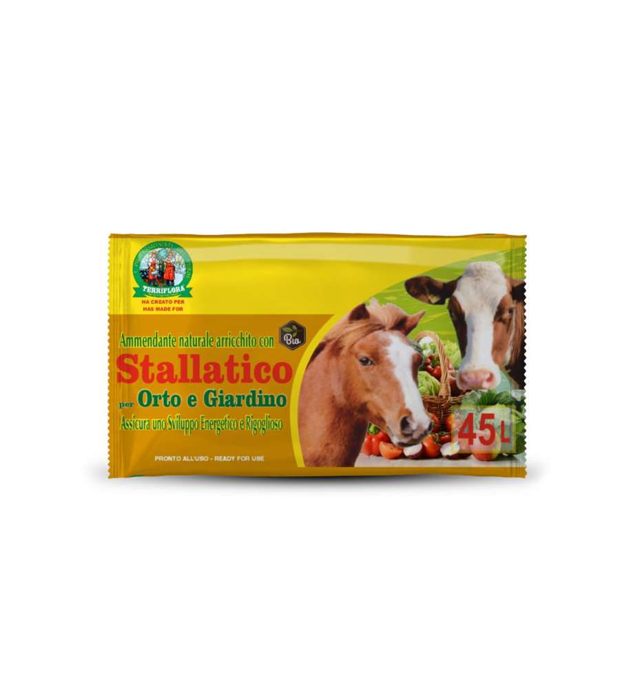 Descrizione: Terriflora Stallatico Organico 45 l: fertilizzante naturale per orto e giardino. Ricco di nutrienti, migliora il suolo e favorisce la crescita di piante ornamentali e da frutto. Pronto all'uso!