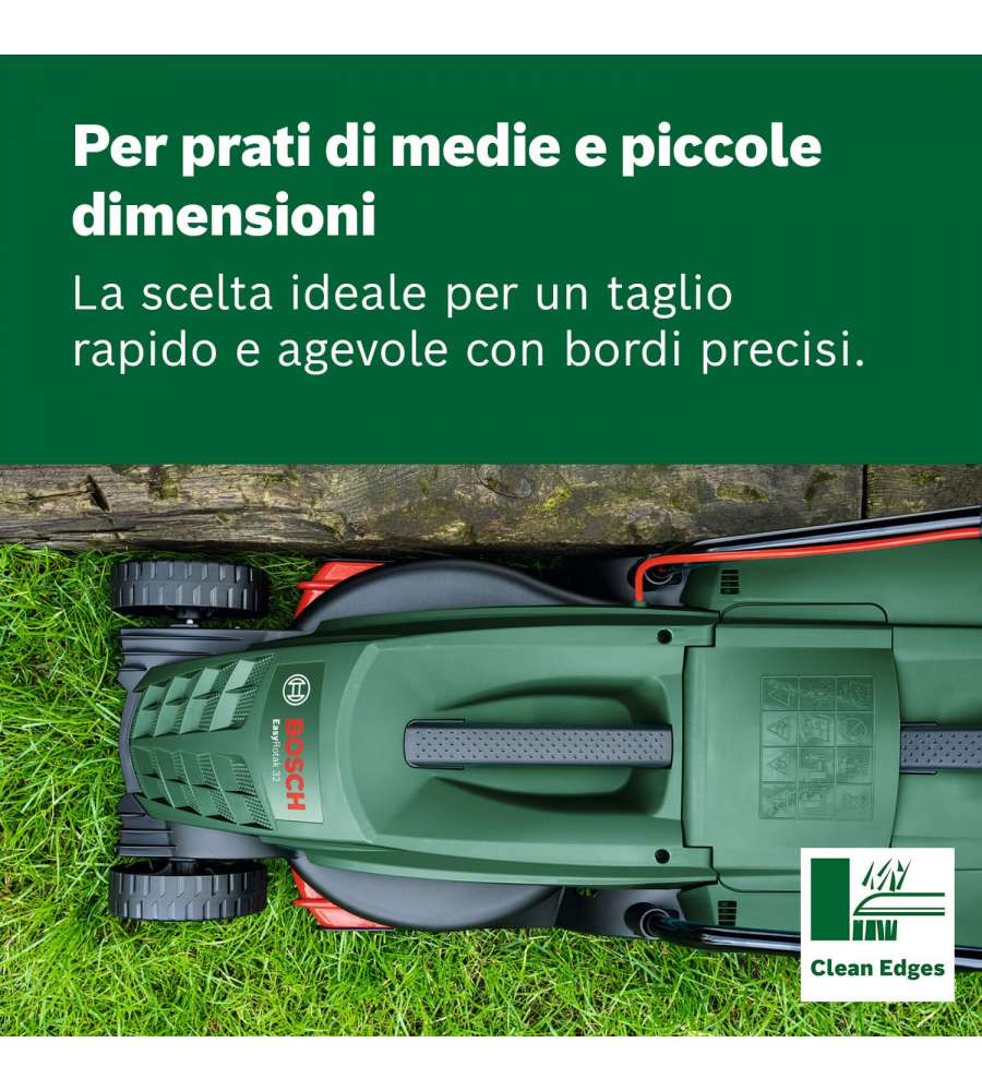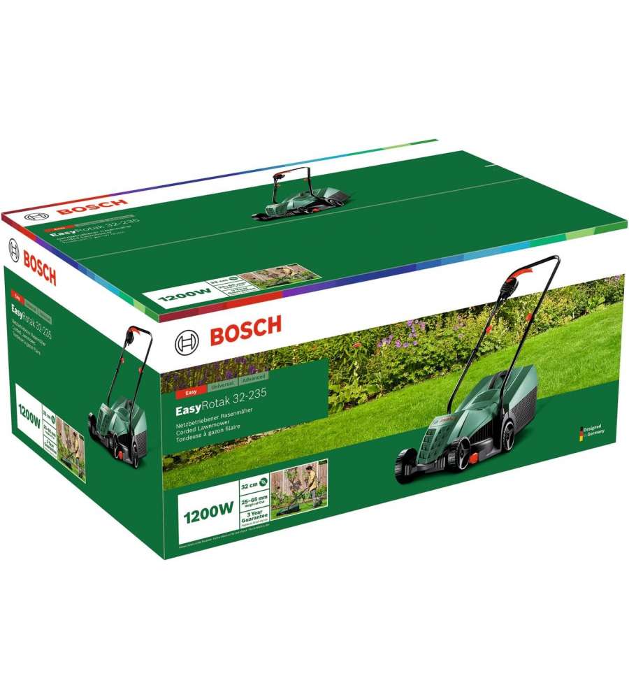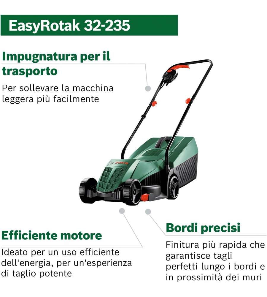 Descrizione: Rasaerba Bosch EasyRotak, larghezza di taglio 32 cm, leggero e maneggevole. Offre un taglio preciso fino ai bordi grazie ai pettini per erba. Motore potente da 1200 W, cesto raccoglierba da 31 l e impugnature pieghevoli per un facile stoccaggio.