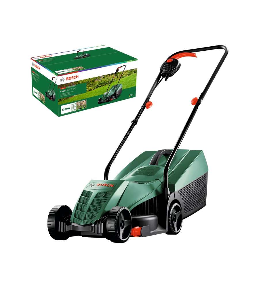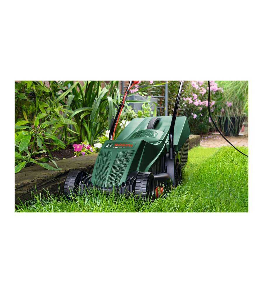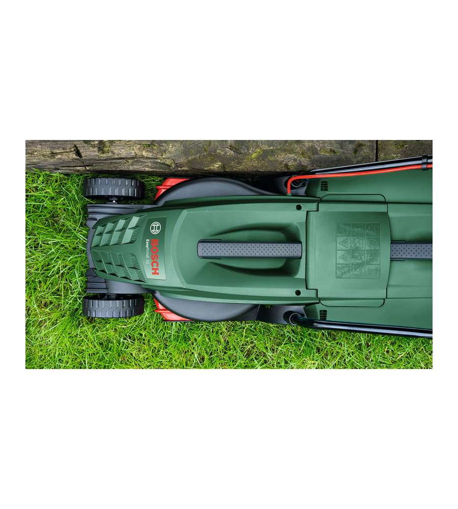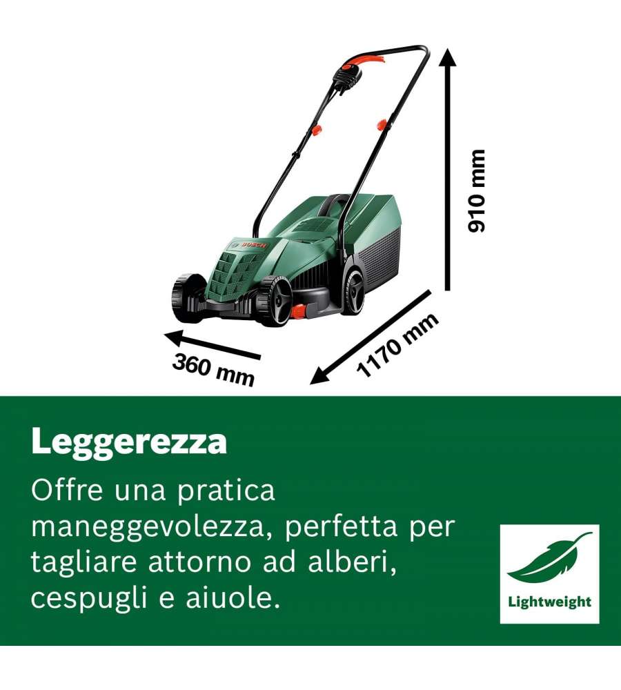 Descrizione: Rasaerba Bosch EasyRotak, larghezza di taglio 32 cm, leggero e maneggevole. Offre un taglio preciso fino ai bordi grazie ai pettini per erba. Motore potente da 1200 W, cesto raccoglierba da 31 l e impugnature pieghevoli per un facile stoccaggio.