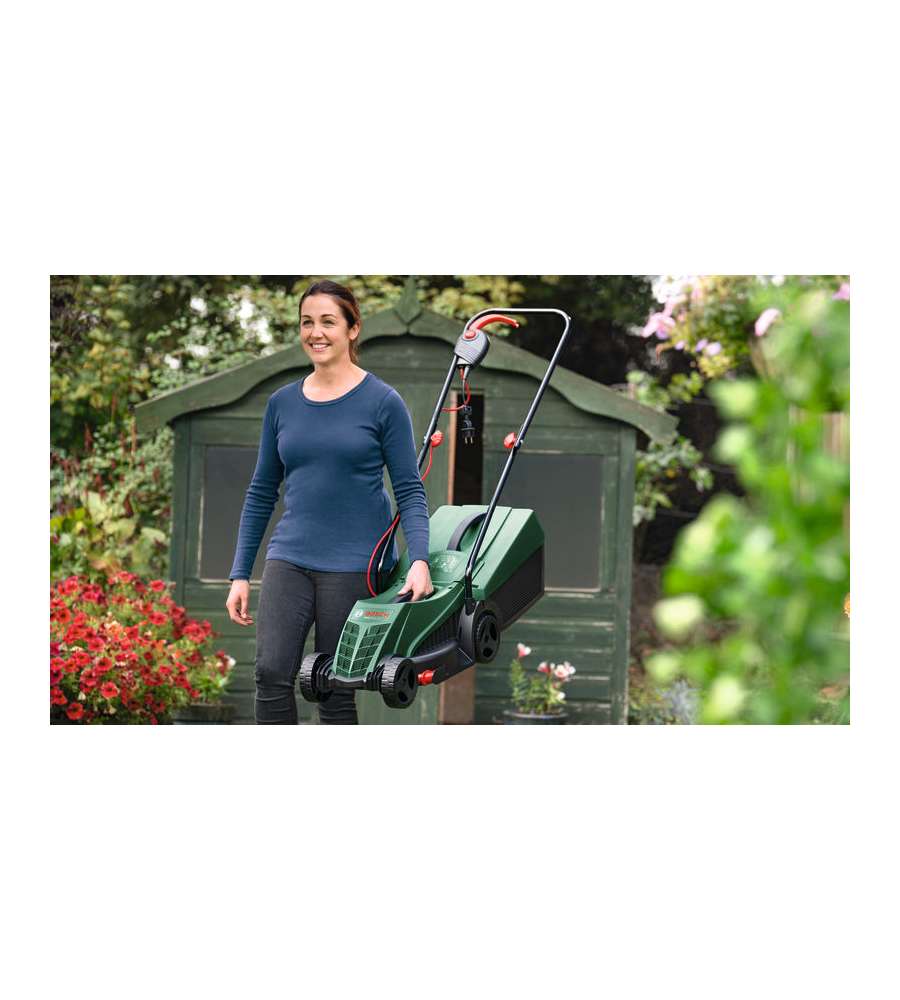 Rasaerba leggero e compatto con motore 1.200 W per tagli precisi fino al bordo. Larghezza di taglio 32 cm, cesto da 31 l e altezza di taglio regolabile (25-65 mm). Coppia di serraggio 13 Nm. Sistema di taglio: lama rotante.Sistema raccolta tagliato: