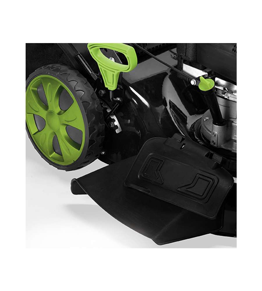 Motore 4 tempi, 139 cc, 2,5 kW, taglio 46 cm, 8 altezze regolabili con leva centrale, trazione posterioreSistema raccolta tagliato: