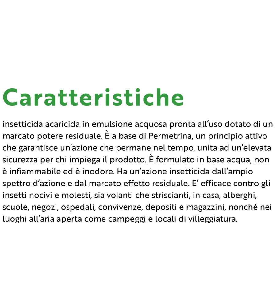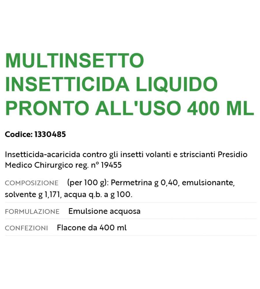 Insetticida Flortis Multinsetto 400 ml, a base di permetrina. Efficace contro insetti volanti e striscianti, con un'azione residuale fino a 3 settimane. Formulazione liquida e inodore, facile da usare su superfici diverse.Destinazione d'uso: