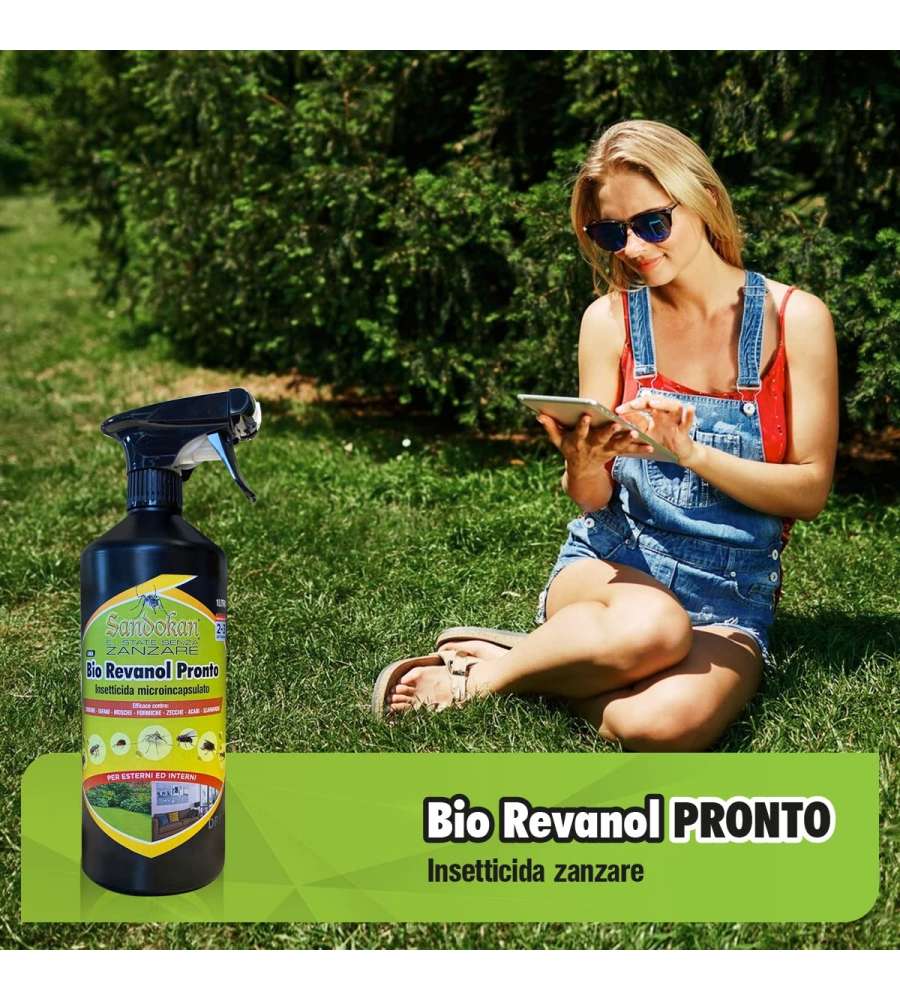 Insetticida Bio Revanol Pronto: adulticida pronto all'uso, effetto immediato e snidante, contiene piretrine naturali e Deltametrina, formulazione acquosa, Made in Italy.
