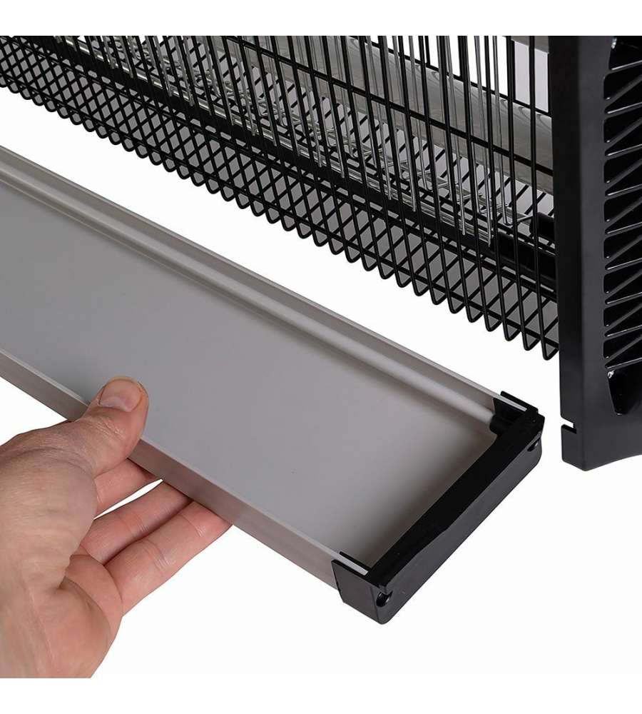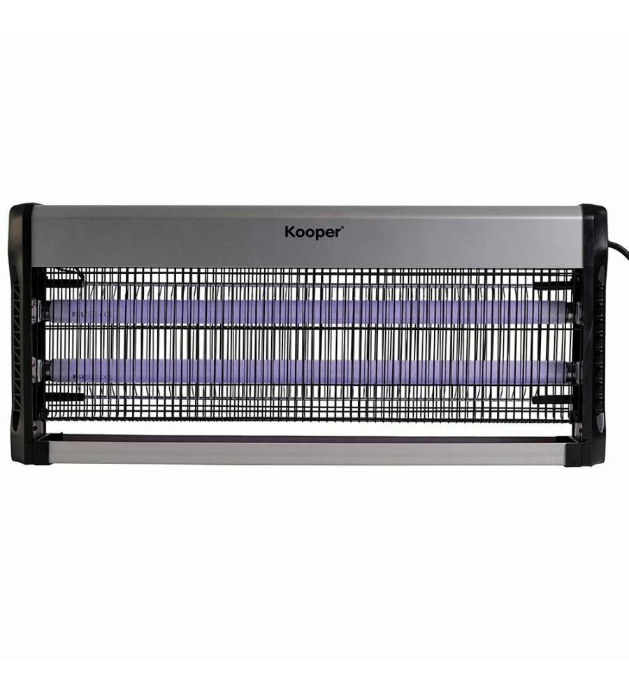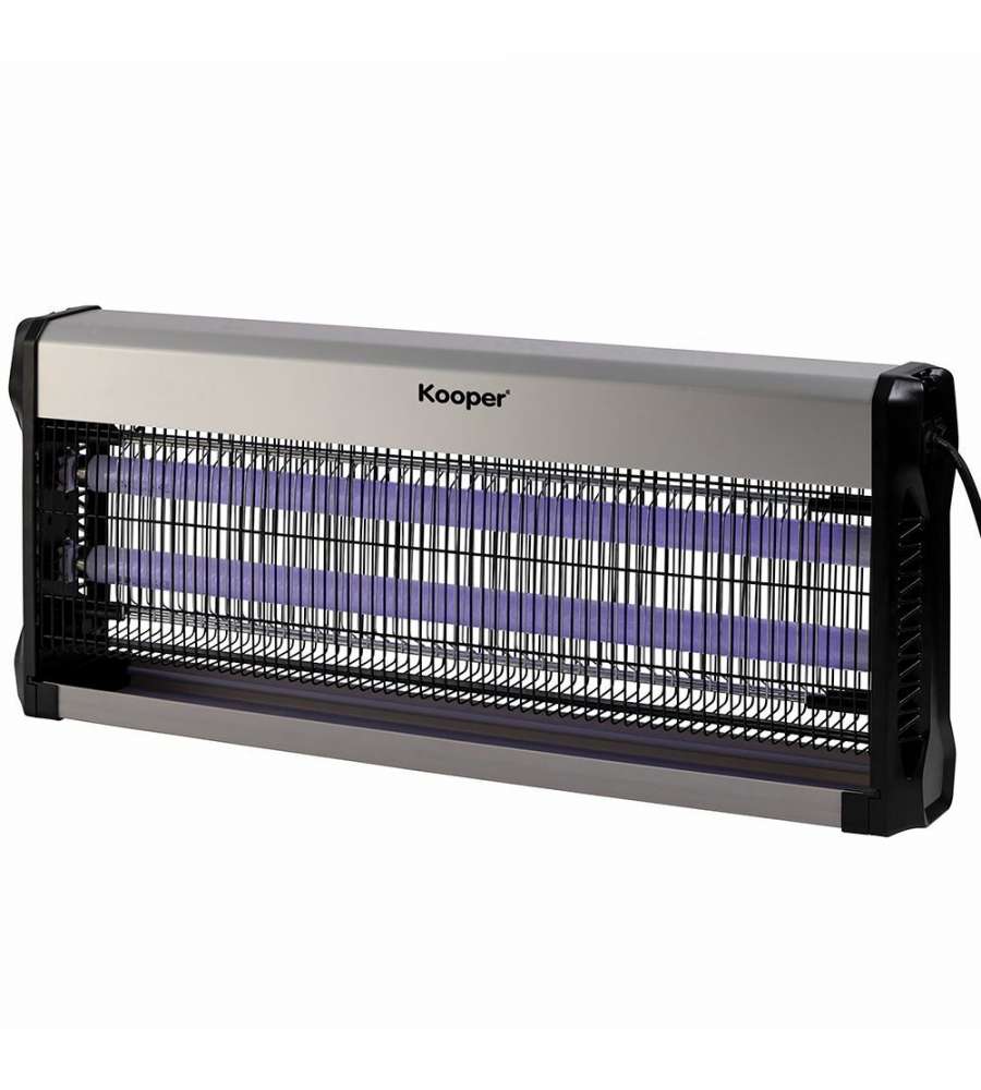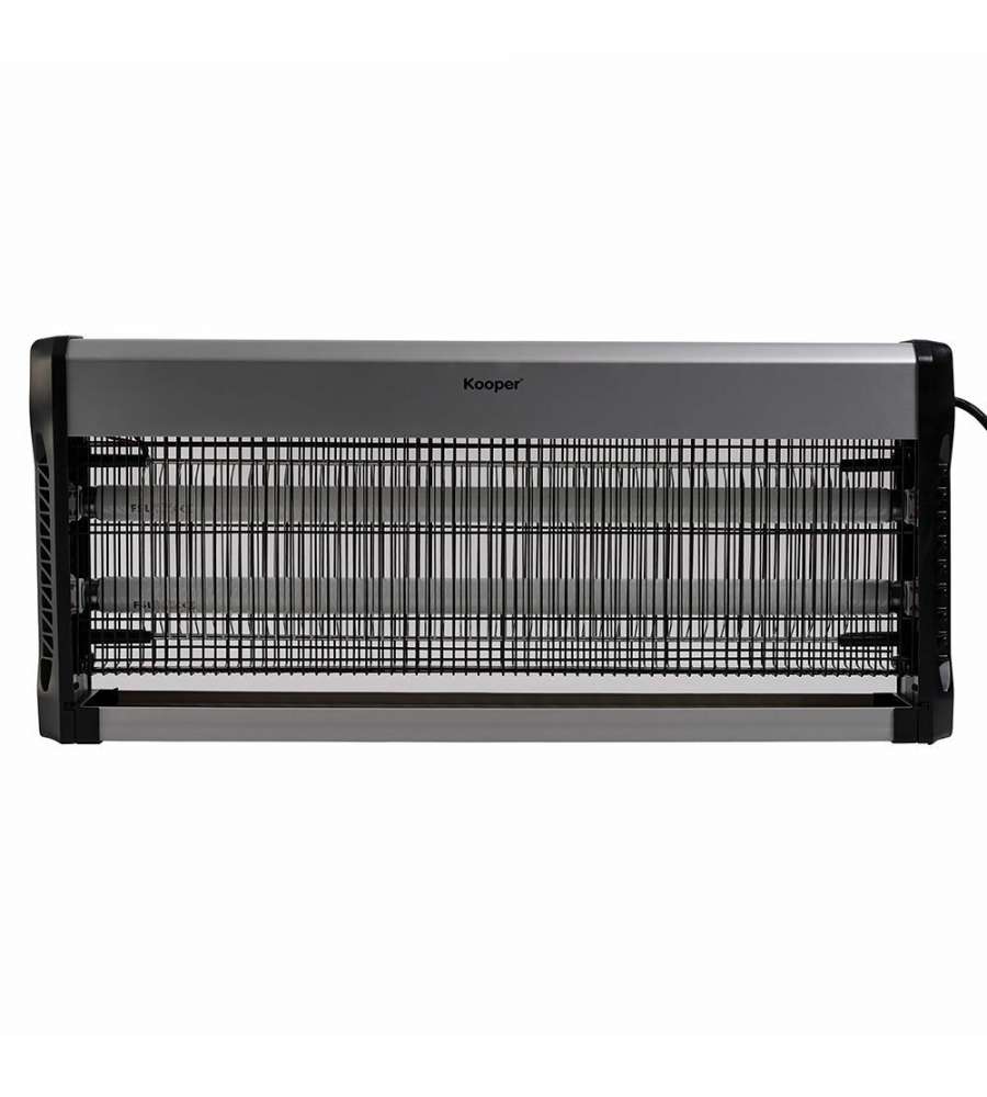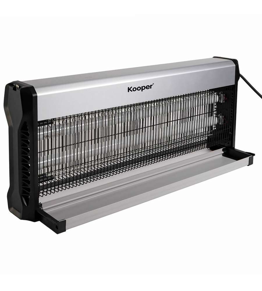 Zanzariera elettrica Kooper Elettra: potenza 40W, copre fino a 20 m². Vano raccolta insetti estraibile, facili pulizie. Struttura in alluminio e ABS, con griglia in ferro. Installazione versatile: parete, soffitto o libera.Capienza: