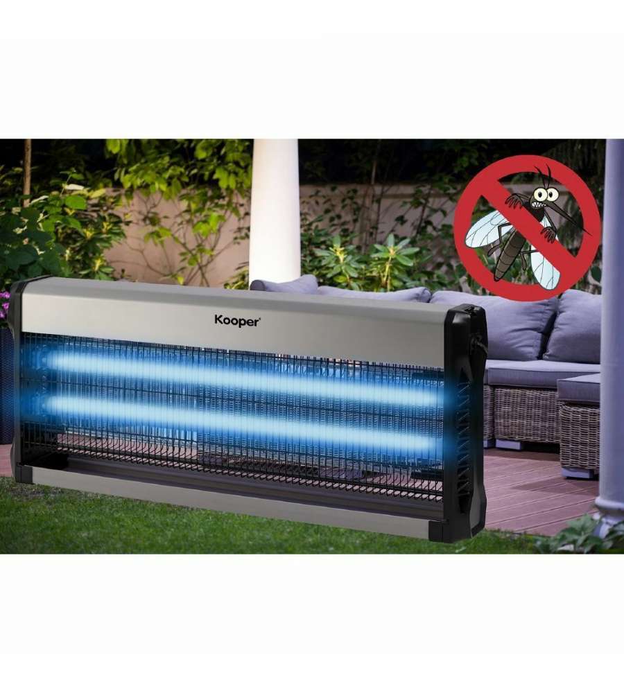 Descrizione: Zanzariera elettrica Kooper Elettra da 40W, copertura fino a 150 mq. Struttura in alluminio e ABS, con vano raccogli-insetti estraibile. Facile da pulire e installare, ideale per ambienti interni.