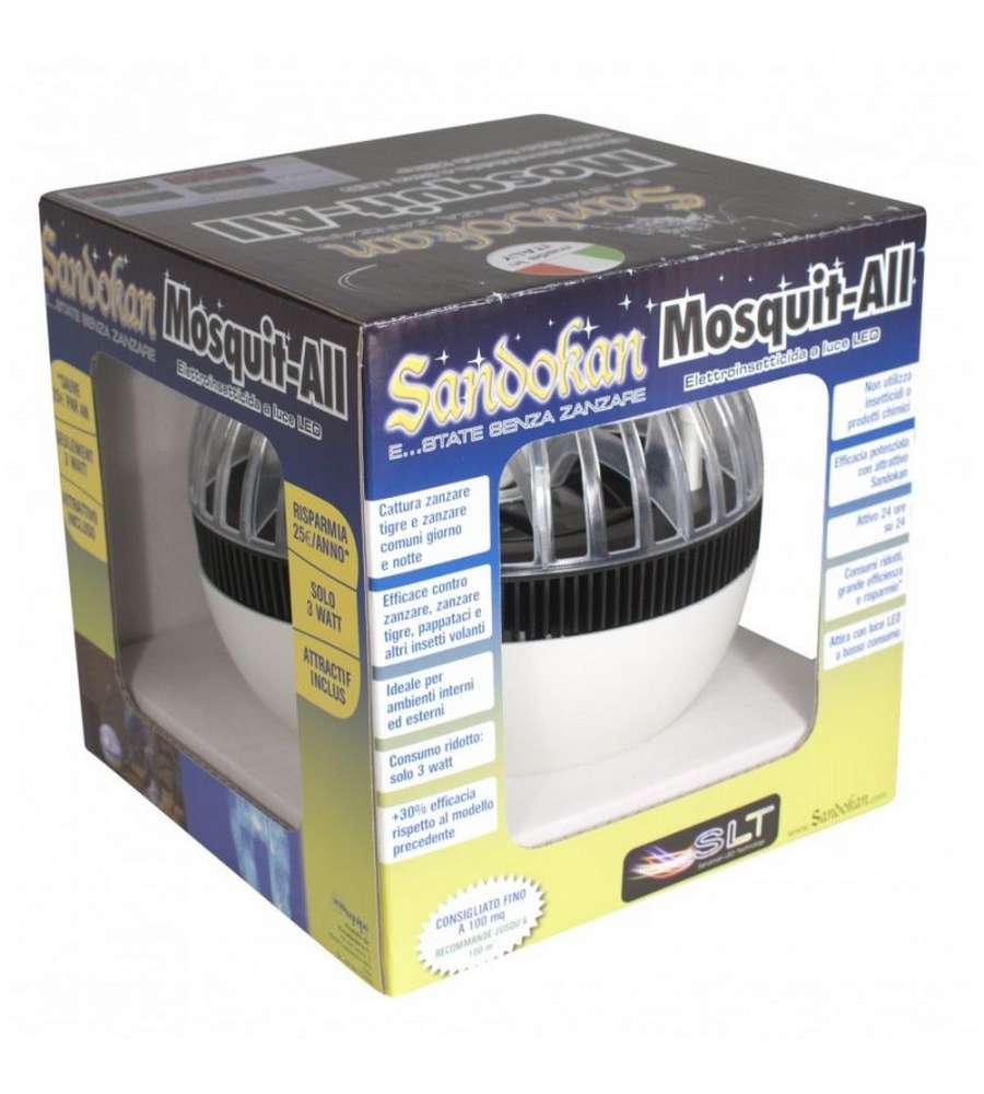 Zanzariera elettrica Sandokan MOSQUIT-ALL con tecnologia LED ad alta luminosità e basso consumo (3W). Ventola potente e silenziosa, aspira gli insetti e li raccoglie in un contenitore filtrante. Ideale per interni/esterni fino a 50 mq.Materiale utensile: