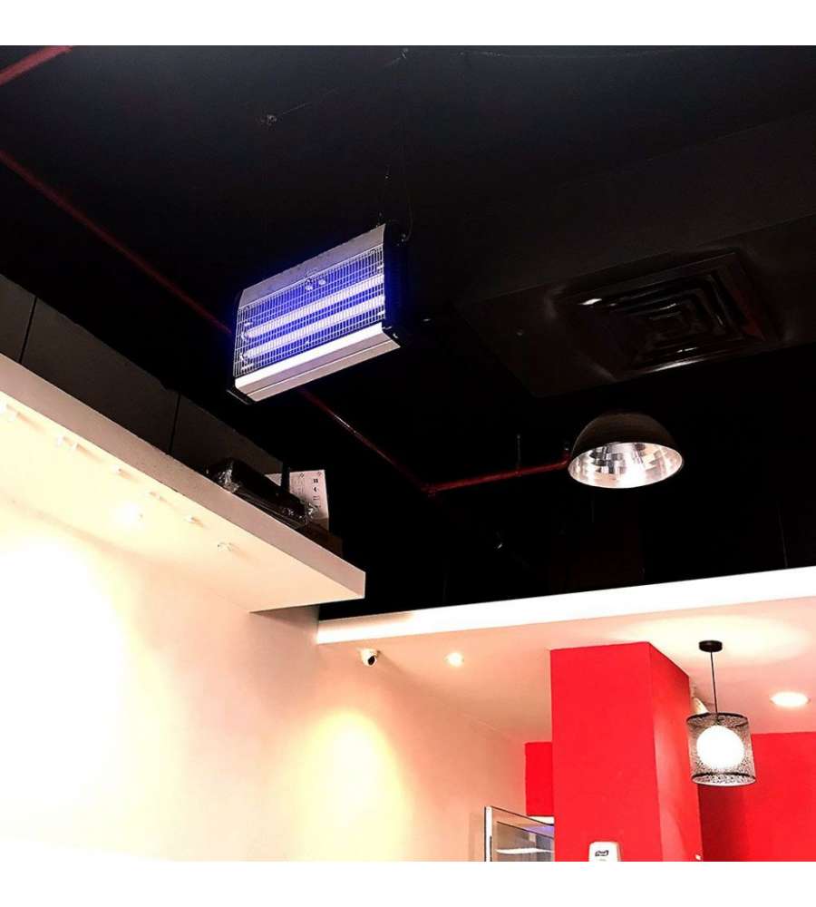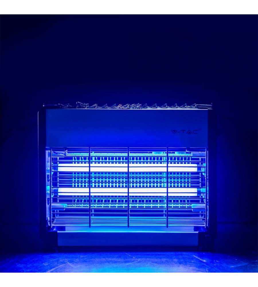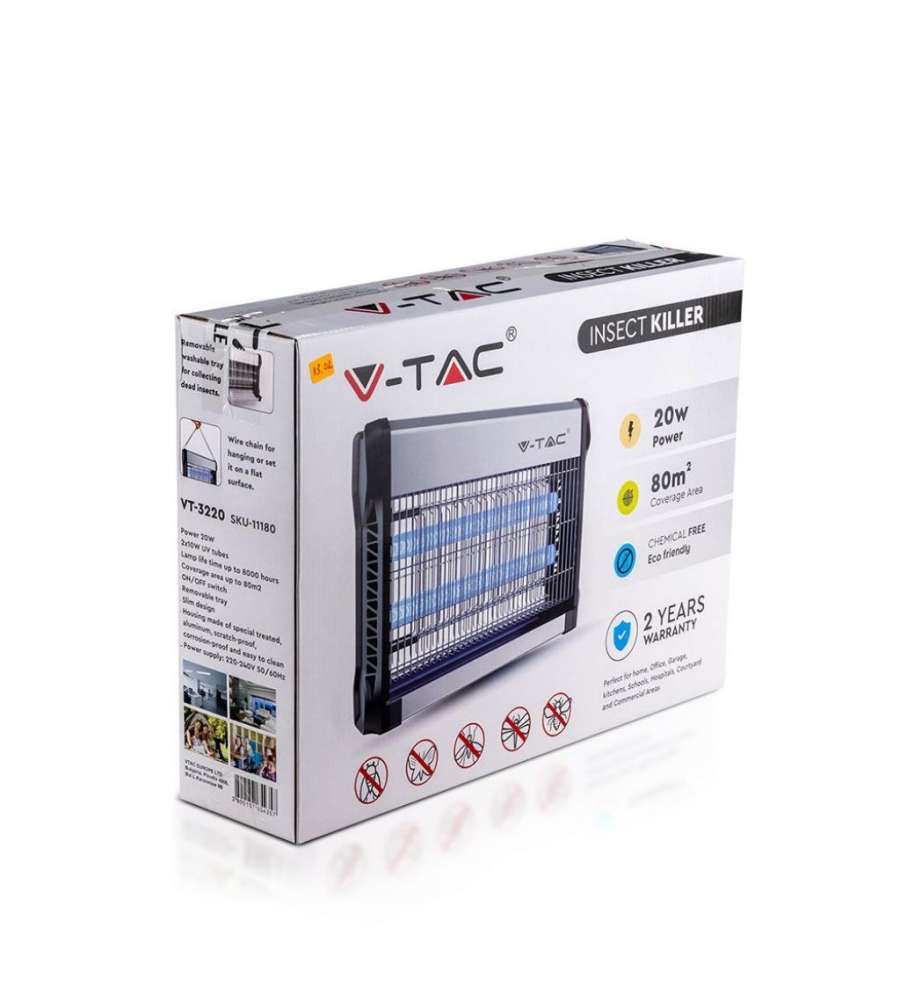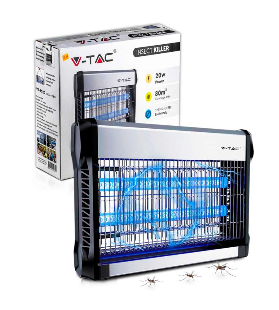 Zanzariera Elettrica V-TAC 11180, potenza 20W (2x10W), copre 80 m². Struttura in alluminio antigraffio, luce UV blu per attirare insetti, sicura per uomo e animali. Ideale per interni ed esterni, senza fumi né odori. Dimensioni: 397x93.5x280mm.Materiale utensile: