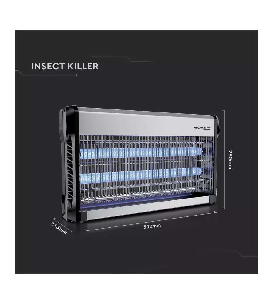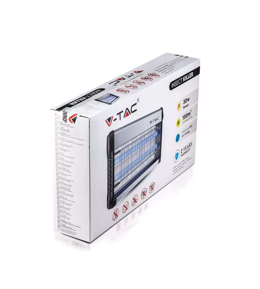 Zanzariera elettrica V-TAC con 2 tubi T8 UV da 15W, copre fino a 100 m². Struttura in alluminio antigraffio, sicura per uomini e animali. Nessun fumo o odore, ideale per interni ed esterni. Potenza totale 30W, dimensioni 502x93.5x280mm.Materiale utensile: