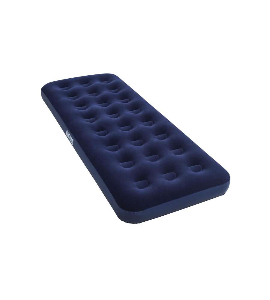 Materassino floccato singolo Bestway, superficie morbida, struttura robusta, dimensioni 185 x 76 x 22 cm, colore blu. Include toppa per riparazione e valvola a vite.Uso interno: