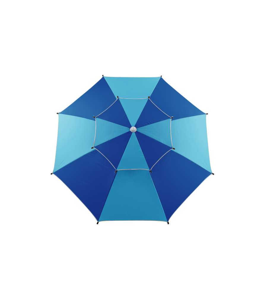 Ombrellone da spiaggia Dr. C. con doppio tetto, struttura leggera in alluminio bianco, tessuto poliestere 200g con protezione UV50+. Sistema di apertura push-up e ancoraggio alla sabbia. Dimensioni: diam. 240cm, altezza 253cm. Antivento e facile da mUso esterno: