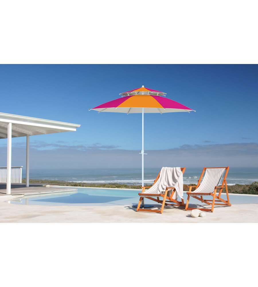 Descrizione: Ombrellone da spiaggia Dr. C. con doppio tetto, in poliestere 200g, protezione UV50+. Facile da montare, palo in alluminio, colori vivaci fucsia-arancio. Ideale per il tuo relax al sole!