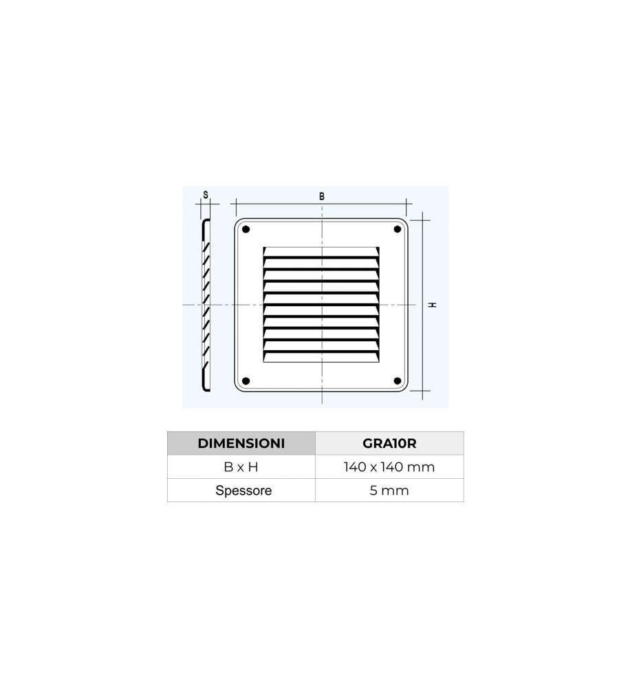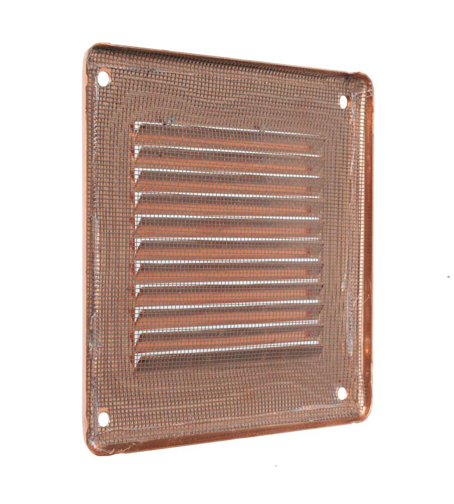 Griglia in rame 140x140 mm, spessore 5 mm, da sovrapporre. Area di passaggio aria: 40 cmq, massima 210 cmq. Facile installazione, rete antinsetti integrata. Design elegante, resistente agli agenti atmosferici, ideale per ambienti interni ed esterni.Altro 1: