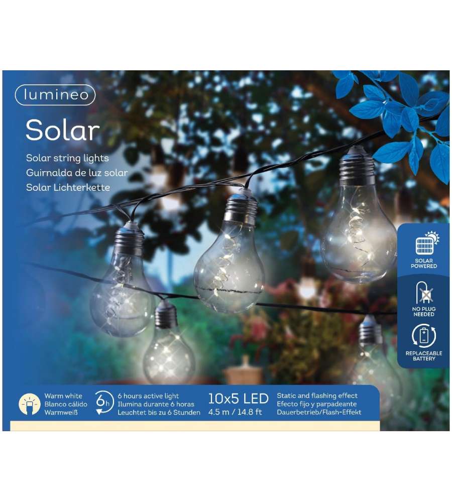 Catena luminosa con micro LED solari. Lunghezza 4,5 m, luce calda. Ideale per esterni, alimentazione a energia solare. Certificazione CE.Tipo luce: