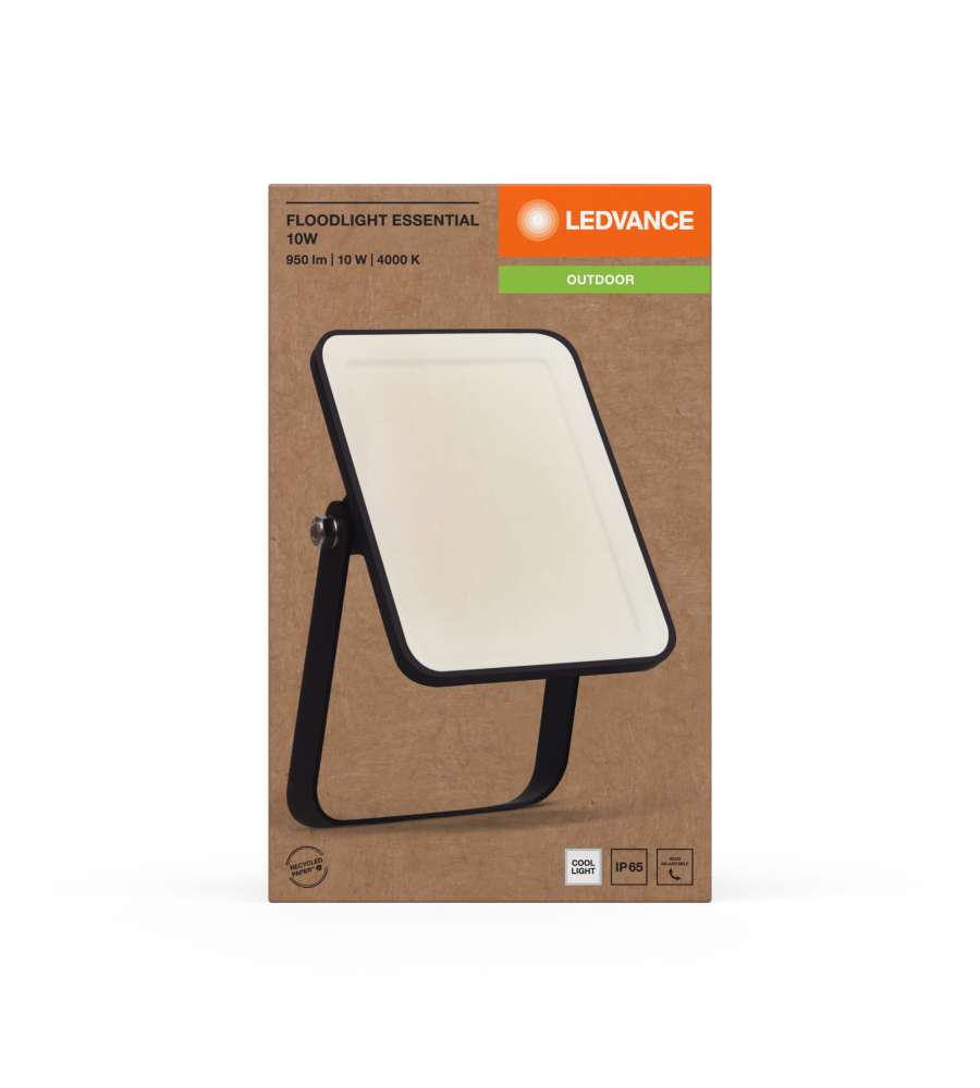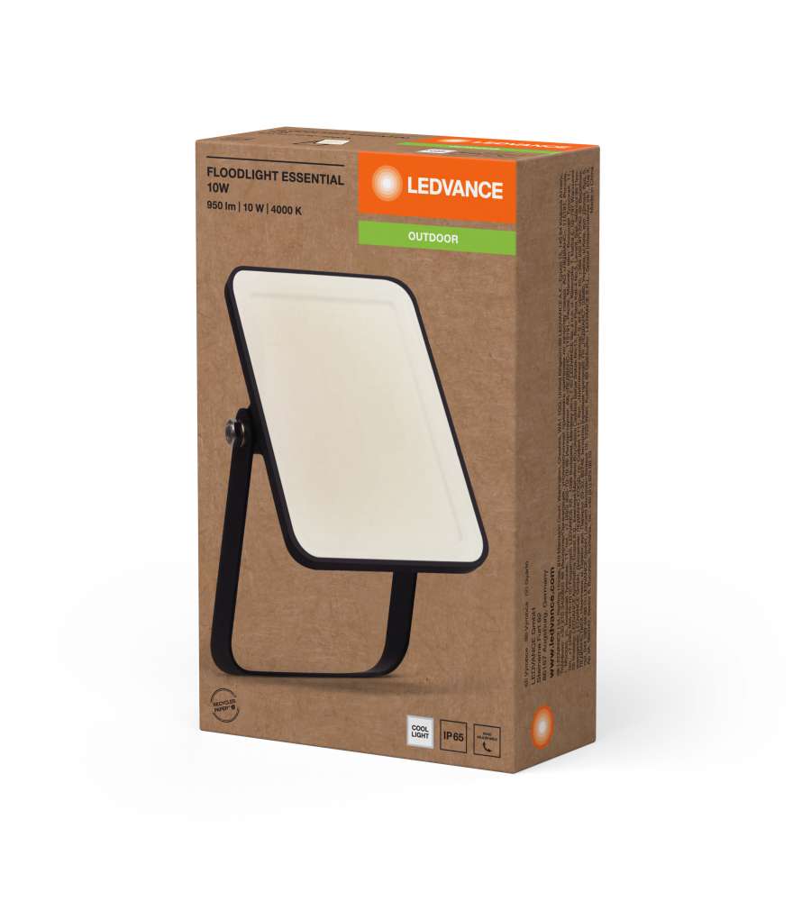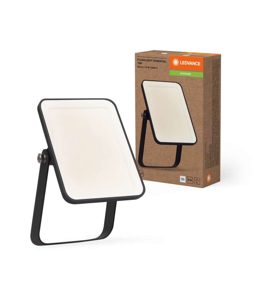 Faretto LED 10W Ledvance Essential, luce bianca fredda 4000K, 900 lm, ampiezza fascio 100°. Ideale per esterni con protezione IP65, corpo in alluminio nero, durata 25.000 ore. Compatto e potente per ogni esigenza di illuminazione.Consumo: