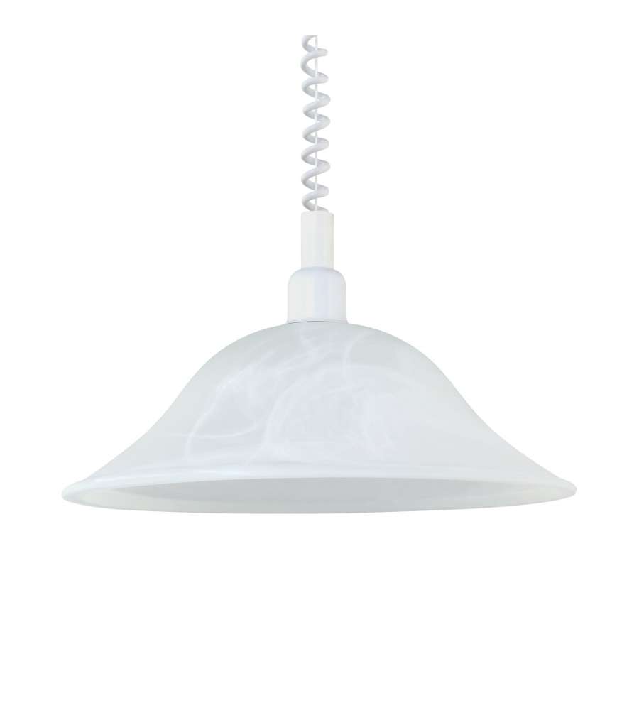Lampada a sospensione con paralume in vetro alabastro bianco e struttura in policarbonato. Altezza regolabile fino a 110 cm, diametro di 38 cm. Compatibile con lampadine E27 fino a 60W. Design elegante, ideale per cucina e sala da pranzo.Garanzia: