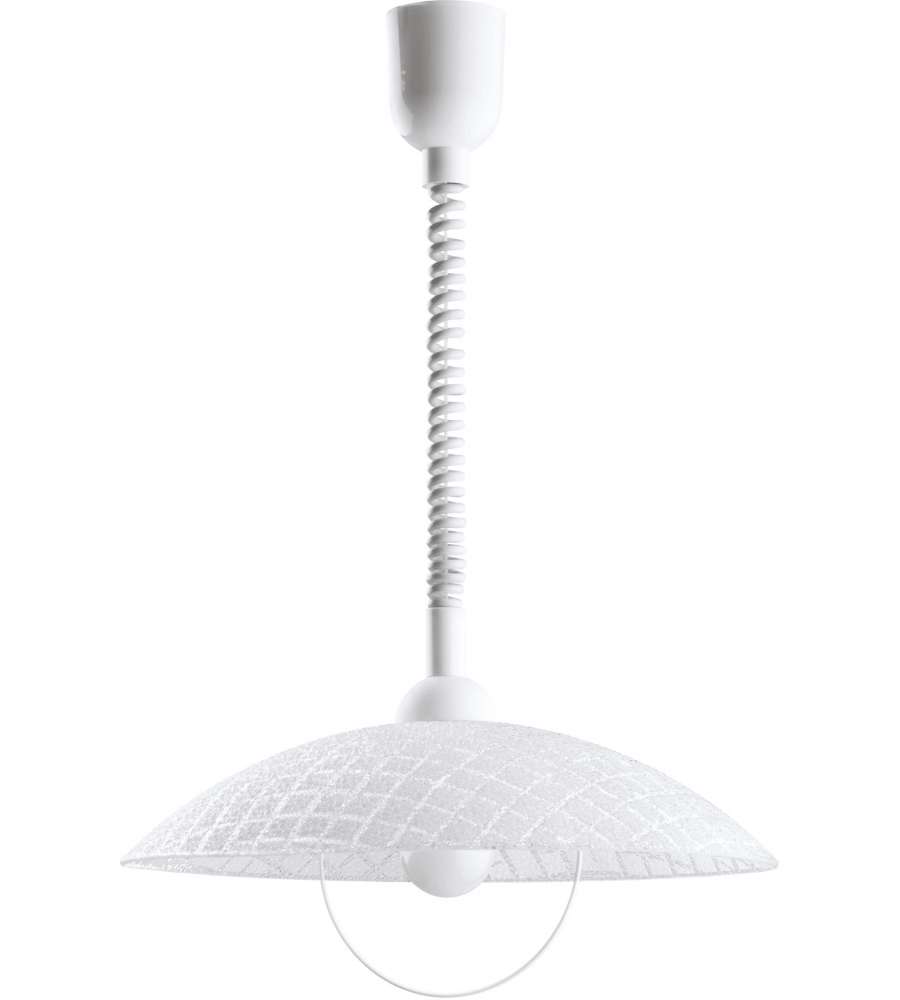Lampada a sospensione con paralume in vetro rigato bianco e struttura in plastica. Regolabile in altezza con cavo a spirale, attacco E27 per lampadine fino a 60W. Design classico, ideale per cucina e sala da pranzo, dimensioni 42x110 cm.Garanzia:
