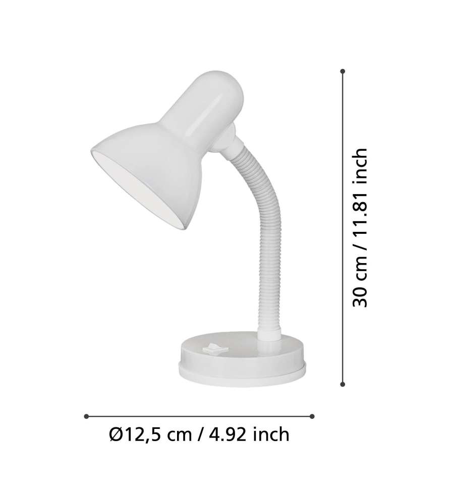 Lampada da tavolo Basic Eglo, design minimalista in policarbonato e metallo bianco. Altezza 300 mm, peso 890 g. Accensione con interruttore basculante. Compatibile con lampadine E27 fino a 40W. Ideale per uso interno. Classe di protezione IP20.Garanzia: