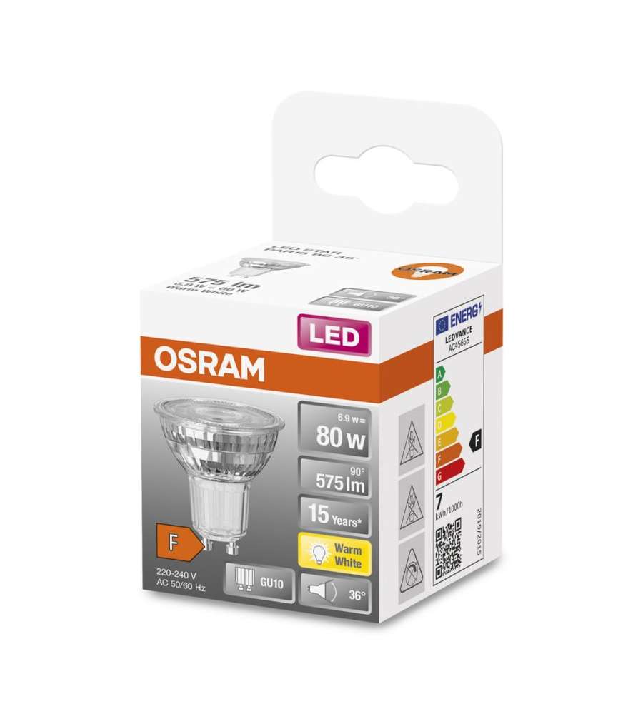 La Osram LED Star Riflettore Spot GU10 PAR16 6.9W 575lm 36D - 827 Bianco Caldo. Sostitutiva 80W è perfetta per la sostituzione della convenzionale Lampada alogena 80W GU10 con colore della luce 827 Bianco Caldo.Tipo attacco: