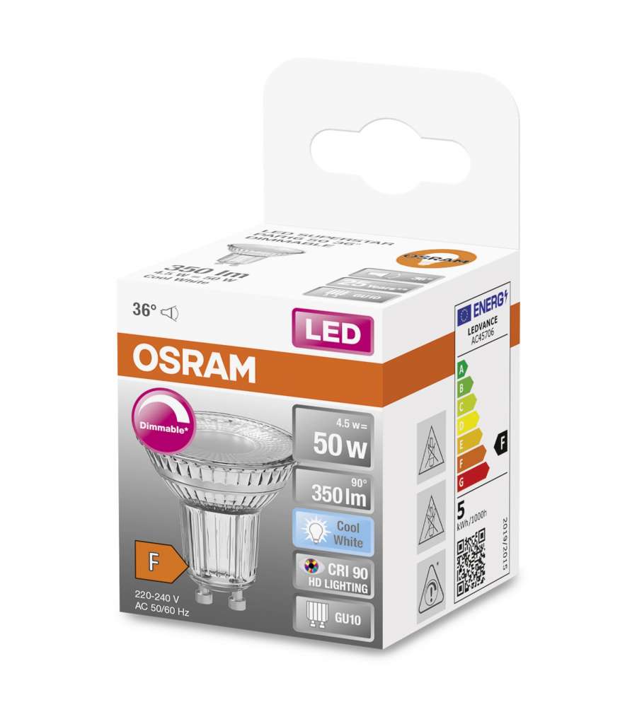 Osram LED Superstar PAR16 Lampada con riflettore LED dimmerabile bianco freddo (4000K), spot in vetro, 5,5 W, ricambio per 50 W GU10Tipo attacco: