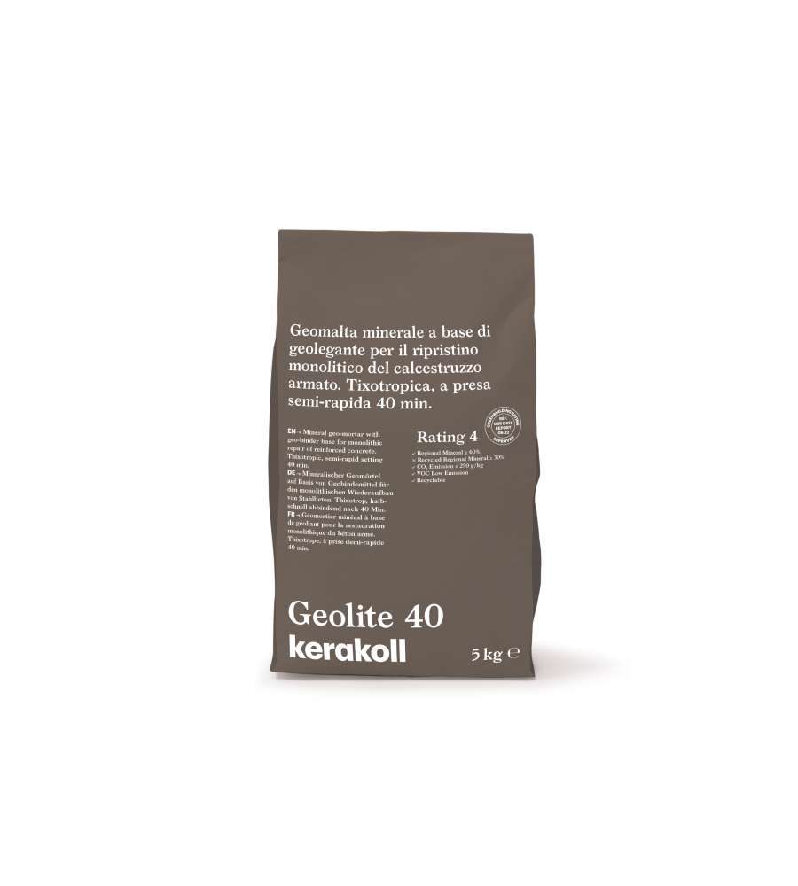 Descrizione: Malta Geolite 40 di Kerakoll, geomalta tixotropica per ripristino monolitico del calcestruzzo armato. Presa semi-rapida, spessori fino a 40 mm, impermeabile e verniciabile dopo 4 ore. Ideale per interventi rapidi!